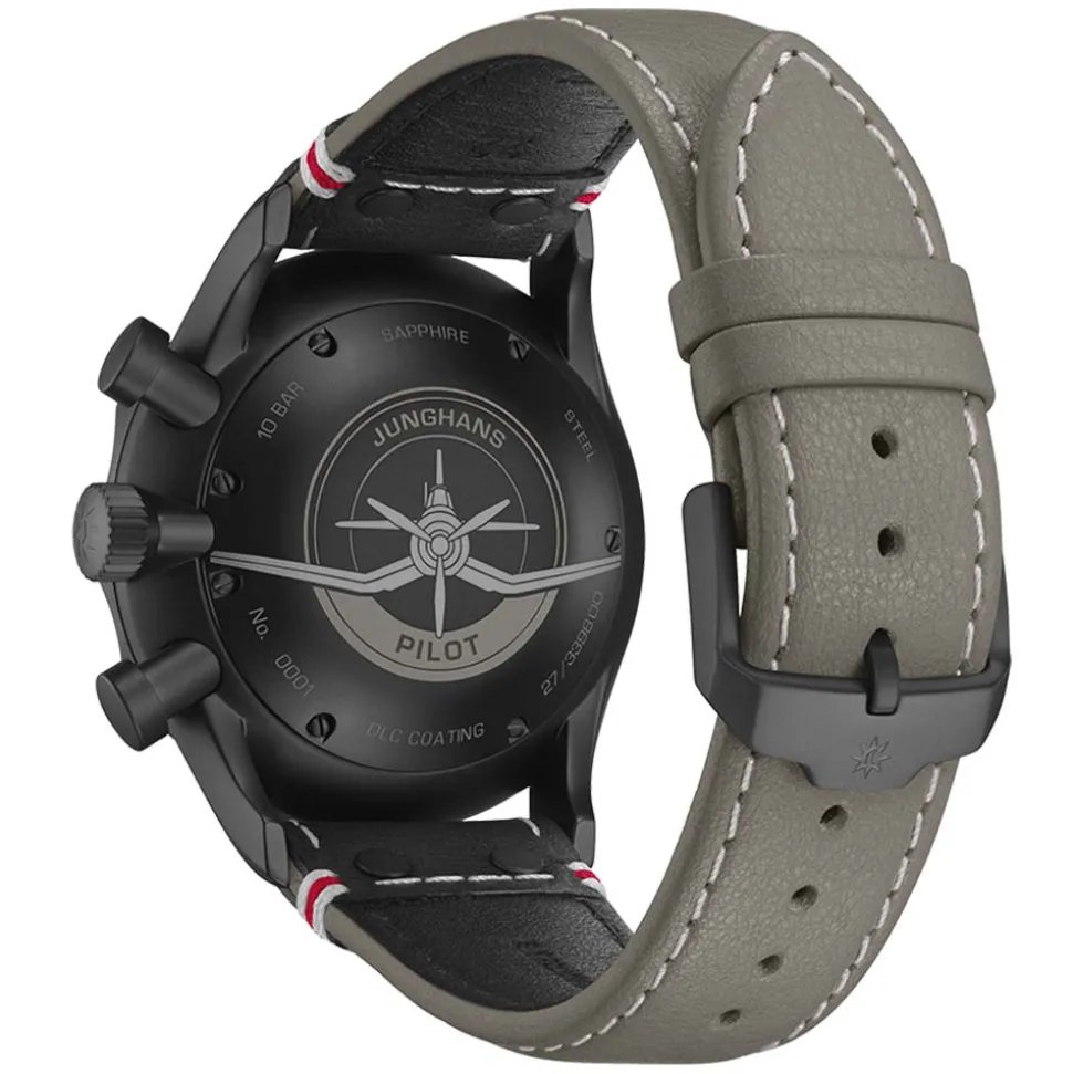 The Junghans Meister Pilot Chronoscope Desert follows in the tradition of the original Bundeswehr Chronograph. However, it is reinvented for today with modern materials and an up to date specification. Firstly, the case is in black/brown DLC (Diamond-like carbon). Secondly, an ergonomically shaped bi-directional bezel ensures a firm grip. Additionally, the sapphire crystal is scratch resistant. Also, it is treated with an anti-reflective coating. Furthermore, beneath the glass, the sand-coloured dial has luminescent, applied numbers and hands to ensure maximum legibility in poor light. Moreover, red detailing on the dial and tips of the chrono and centre seconds hands further aids visibility.