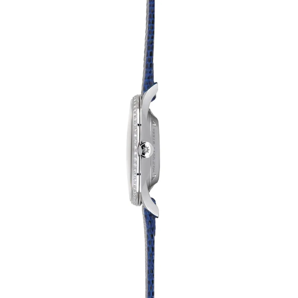 - Blue lizard leather strap with stainless steel pin buckle