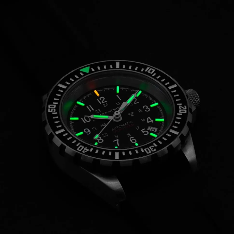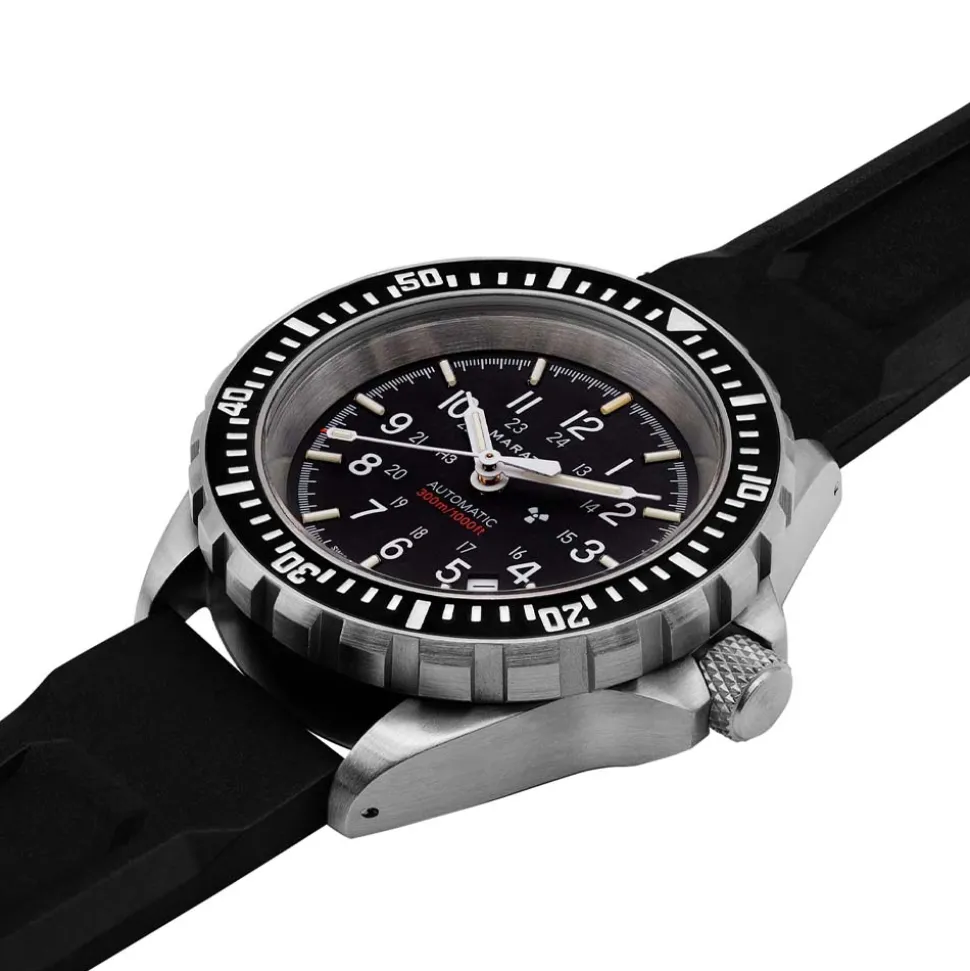 - Black dial, luminescent hands and indices utilising MaraGlo™ and tritium gas tube technology