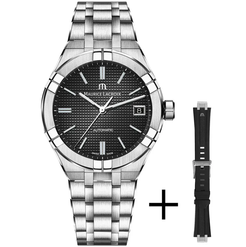 The Maurice Lacroix Aikon Automatic Black Dial 39mm Watch is an elegant but practical timepiece. Now supplied with an additional black FKM rubber strap, you can easily exchange the strap and bracelet yourself.