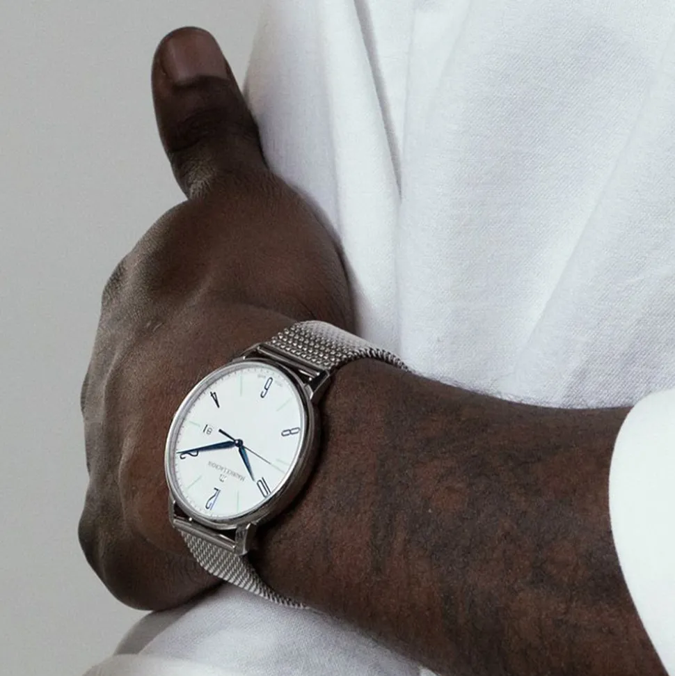 Firstly, in polished stainless steel, the case is 40mm in diameter. Consequently, it’s comfortable for any wrist size. Secondly, the white lacquered dial is available for the first time with arabic numerals (view the blue dial version here). These are in blue and alternate with green printed indexes. Similarly, the hands are also striking in a blue tone. Furthermore, a printed minute track around the edge of the dial ensures legibility. Also, a date window at 3 o’clock is a useful feature. Finally, choose the Milanese bracelet for a sleek look. However, for a more relaxed feel, it’s easy to exchange the bracelet yourself for the blue leather strap. In a soft finish, white contrast stitching matches the dial.
