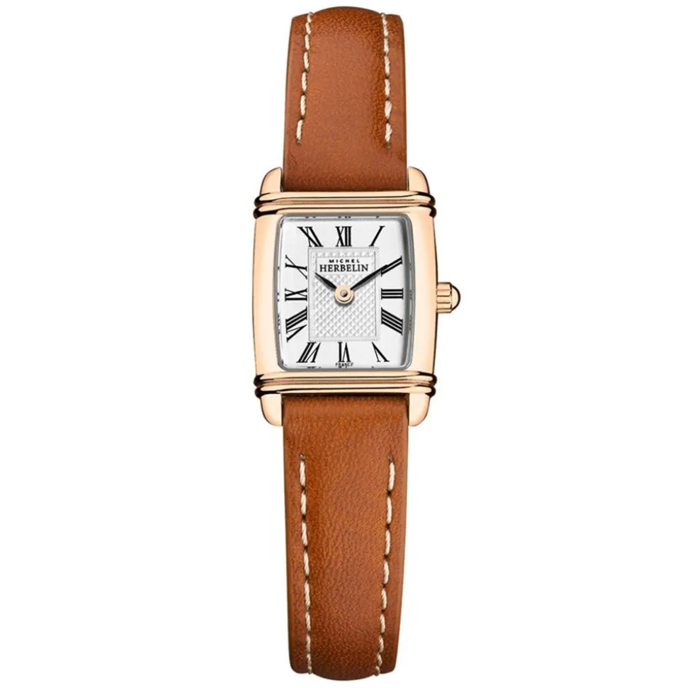 This Michel Herbelin Art Déco Tan Leather Strap Watch is a new addition to the popular Art Déco collection. Inspired by the earliest Michel Herbelin creations, the Art Déco influence can be seen in the elegant double rim of the barrel-shaped case and fluted crown.