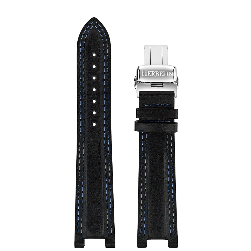 Michel Herbelin Black Leather Blue Stitched Newport Watch Strap