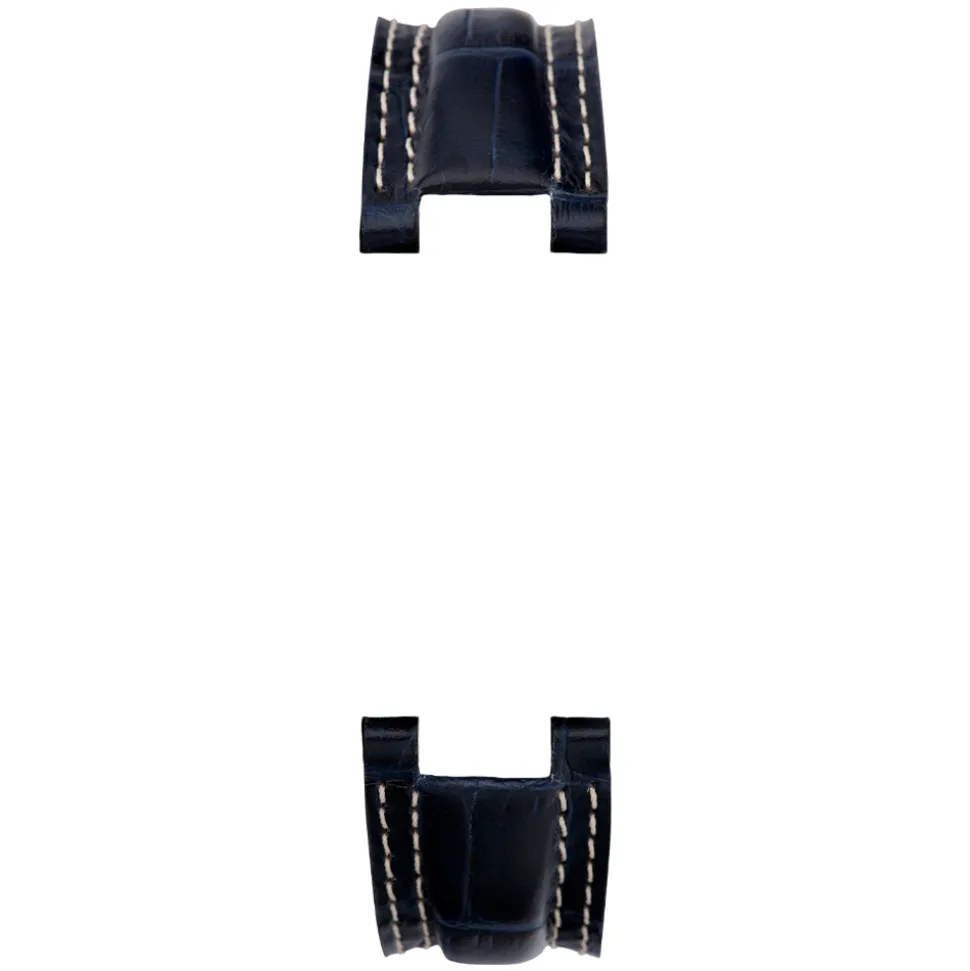 The strap is in Marine Blue crocodile-grain leather. Also, it has a double row of white contrast stitching for a sporty, high quality finish.
