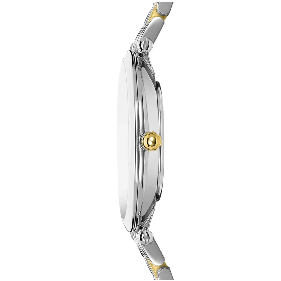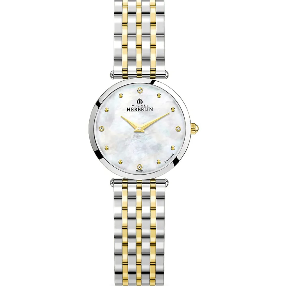 This extra flat Michel Herbelin Epsilon Two Tone Bracelet Watch is for the woman who demands understated, clean lines and unsurpassed craftsmanship. Firstly, with it’s slim case, this two tone stainless steel version has an utterly timeless appeal. Secondly, the white mother of pearl dial with diamond accents gives the watch a luxury feel. Additionally, the polished two tone bracelet feels gloriously fluid and tactile to the touch. Finally, the clasp is a folding style with side release buttons to ensure the security of the watch.