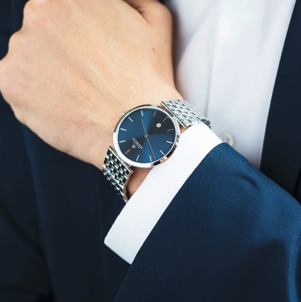 Firstly, the midnight blue dial has applied hour indexes and is clean and legible. Additionally, a date function at 6 o’clock is a useful feature. Secondly, the highly polished bracelet feels gloriously fluid and tactile to the touch. The clasp is a folding style with side release buttons to ensure the security of the watch. With a reliable Swiss ETA quartz movement and scratch-resistant sapphire crystal, this Michel Herbelin Epsilon Bracelet Watch is a contemporary classic.