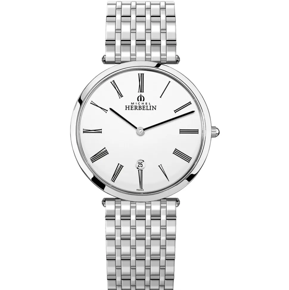 The extra flat Michel Herbelin Epsilon Roman Dial Bracelet Watch is for the man who demands understated, clean lines and unsurpassed craftsmanship. With its slim case, this polished stainless steel version has an utterly timeless appeal.
