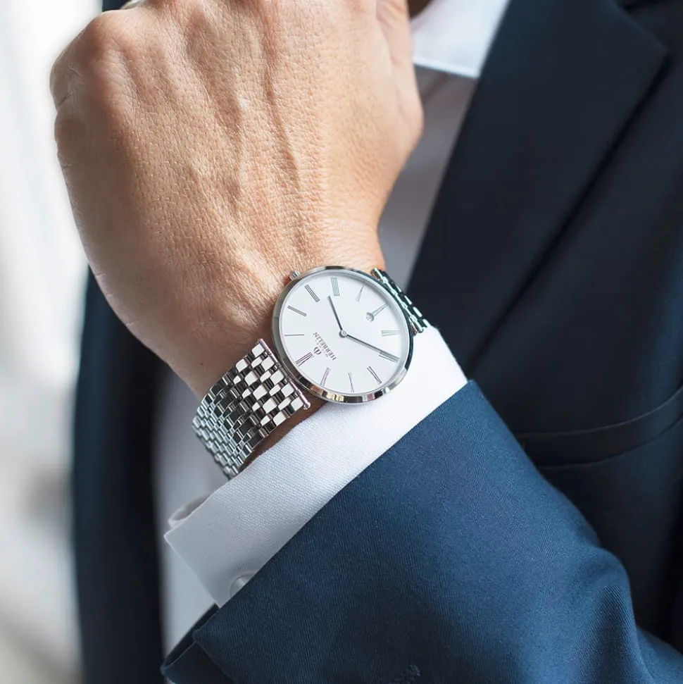 Firstly, the white dial has black printed roman numerals is clean and legible. Additionally, a date function at 6 o’clock is a useful feature. Secondly, the highly polished bracelet feels gloriously fluid and tactile to the touch. Furthermore, the clasp is a folding style with side release buttons to ensure the security of the watch. Finally, with a reliable Swiss ETA quartz movement and scratch-resistant sapphire crystal, this Michel Herbelin Epsilon Bracelet Watch is a contemporary classic.