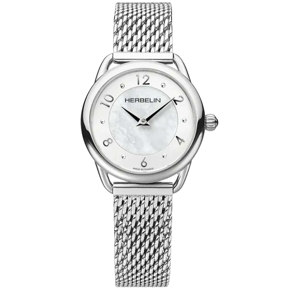 The Michel Herbelin Equinoxe Milanese Bracelet Watch is the ultimate classic timepiece for any woman. Firstly, this polished stainless steel version has an elegant, rounded case. Secondly, the white dial is chic with applied silver tone arabic figures and dot hour markers at the outer edge. Additionally, the central chapter ring is in white mother of pearl. Silver tone hands complement the dial. With its stainless steel milanese bracelet, this understated timepiece lets the quality of the materials used and craftsmanship employed shine through.