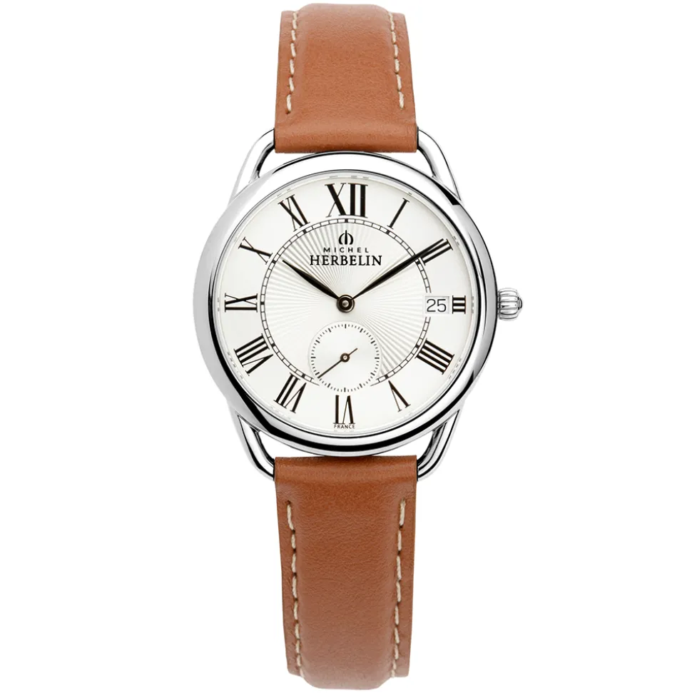 The Michel Herbelin Equinoxe Tan Leather Strap Watch is the ultimate classic timepiece for any woman. Firstly, this polished stainless steel version has an elegant, rounded case. Secondly, the silver dial is chic with black printed roman numerals. Additionally, the central chapter ring has an elegant sunray finish and a sub dial at 6 o’clock displays the seconds. Traditionally-shaped black hands complement the dial. Similarly, the plain tan leather strap with white contrast stitching is also classic in style.
