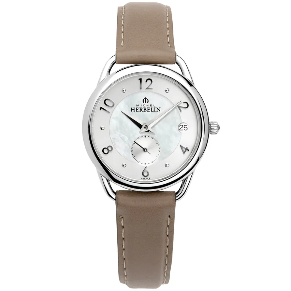 The Michel Herbelin Equinoxe Taupe Leather Strap Watch is the ultimate classic timepiece for any woman. Firstly, this polished stainless steel version has an elegant, rounded case. Secondly, the white dial is chic with applied arabic numerals in stainless steel. Additionally, the central chapter ring is in white mother of pearl with a sub dial at 6 o’clock which displays the seconds. Polished steel hands complement the dial. With it’s taupe calf leather strap with natural lining and stainless steel pin buckle engraved with the HERBELIN logo, this understated timepiece lets the quality of the materials used and craftsmanship employed shine through.