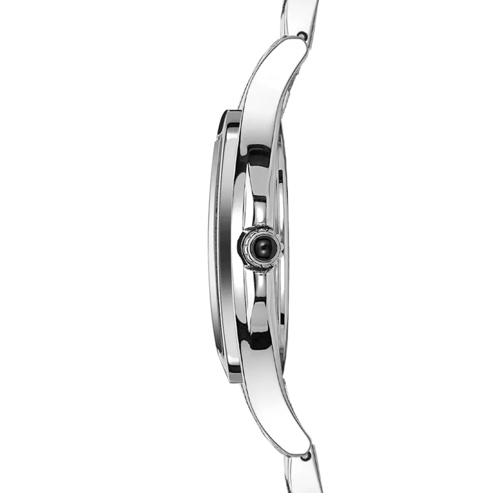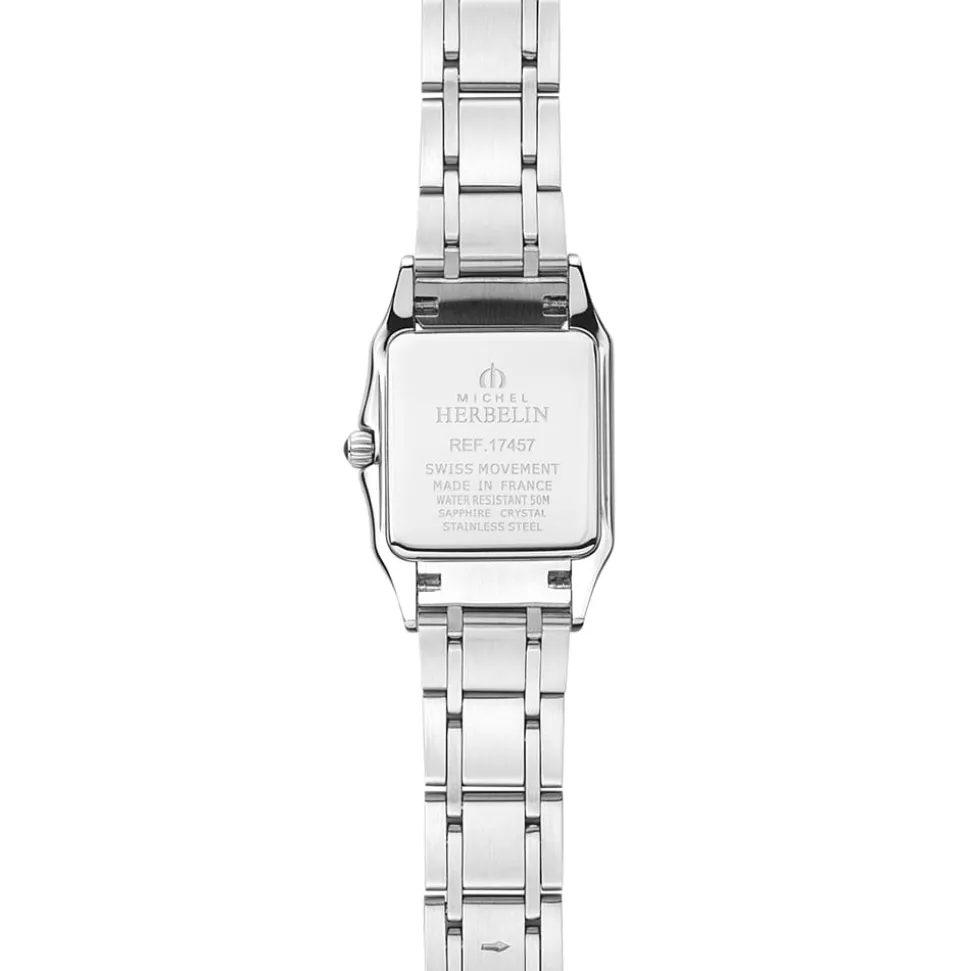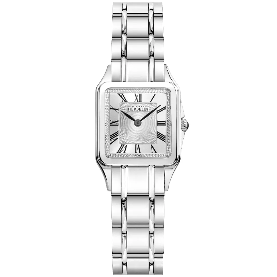 This classic Michel Herbelin Luna Bracelet Watch ticks all the right boxes. The 24mm stainless steel case is a soft square shape with beautifully finished curved lines which are carried through into the tactile bracelet. The dial is in silver with elegant roman numerals in black. To contrast with the dial, the fluted crown is set with an eye-catching blue cabochon stone.