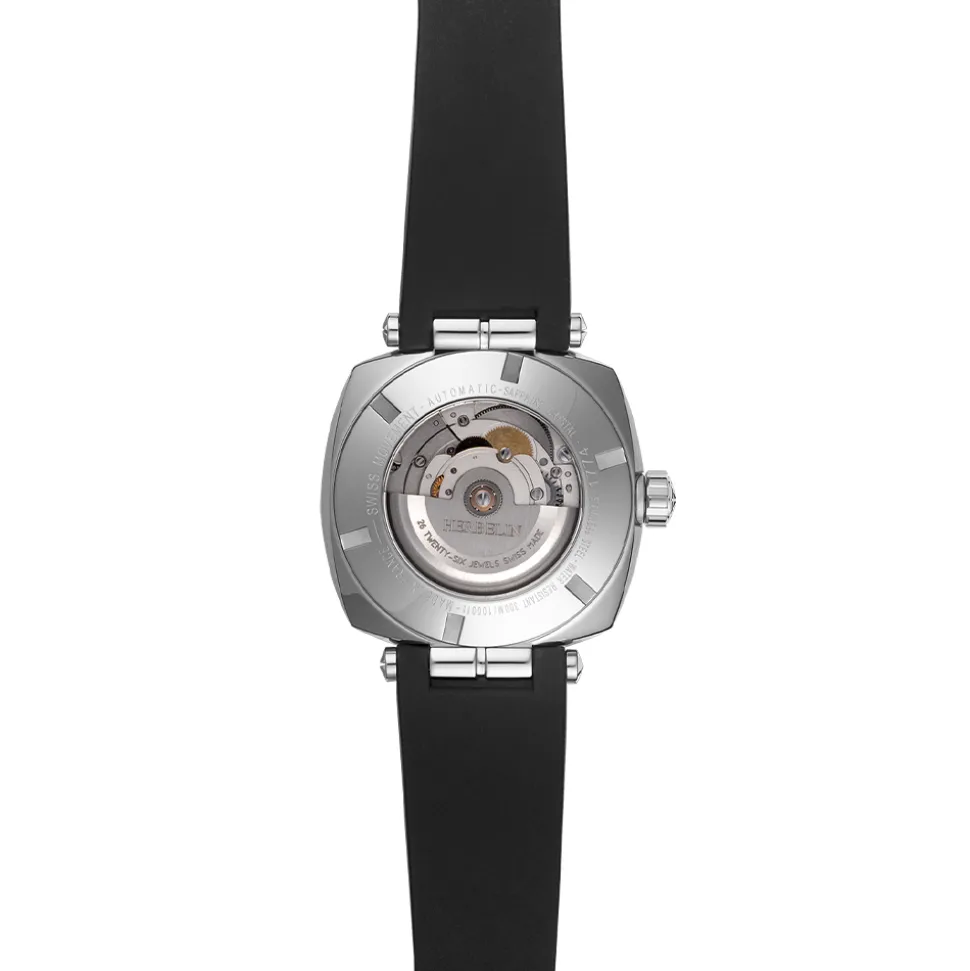 Firstly, the new Diver Automatic model has a striking 42mm cushion-shaped case. Crafted from stainless steel, the bezel has a black ceramic insert. Similarly, the dial is also in black. Additionally, the chunky luminous hour markers and hands allow for visibility even in poor light. Furthermore, the easy-grip crown has a ship’s wheel motif.