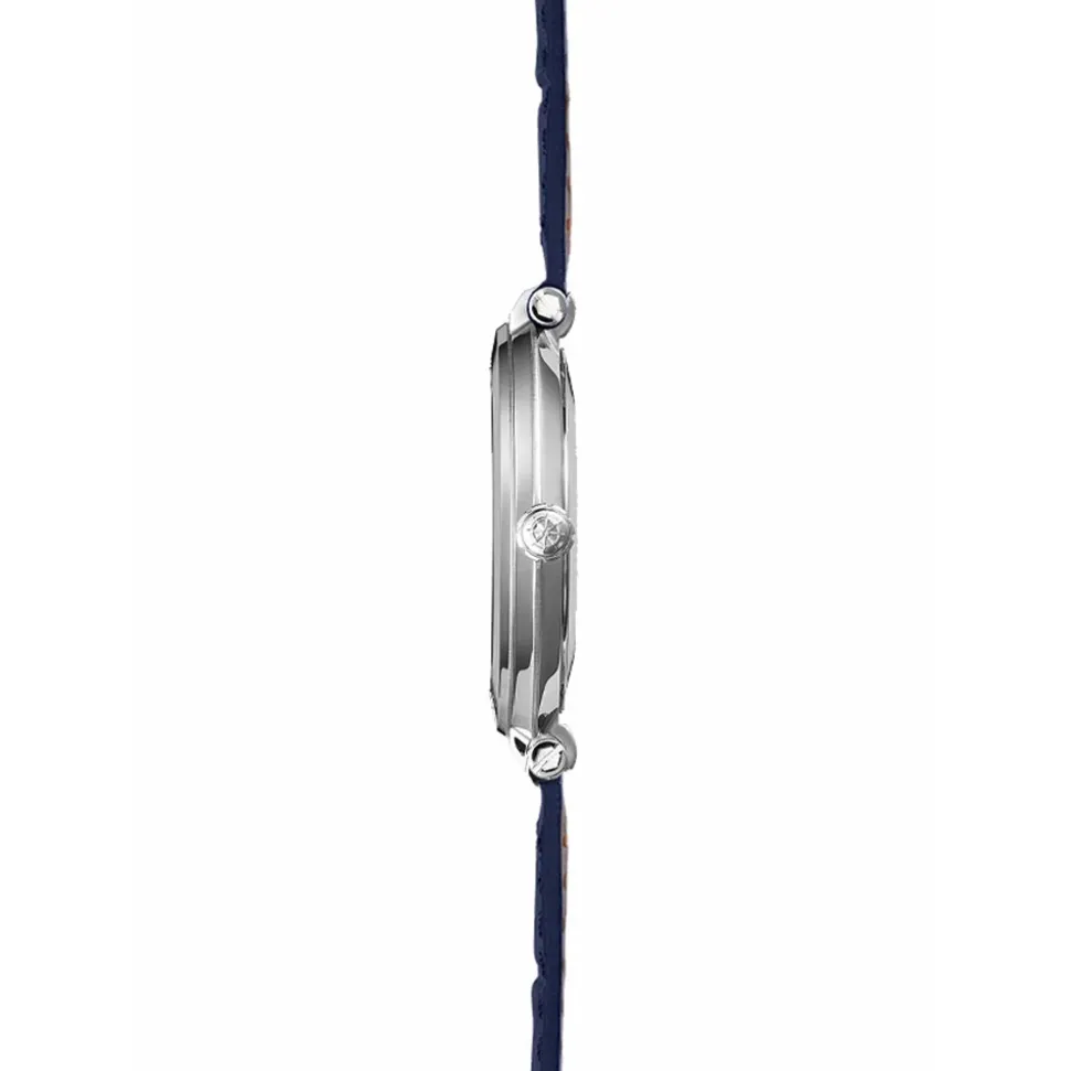 A smart blue leather strap with printed alligator pattern secures the watch to the wrist. Also, it has a double row of stitching for a high quality finish.