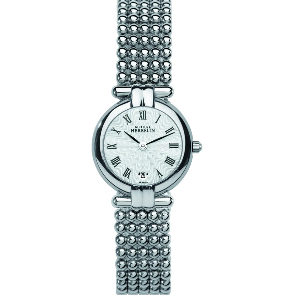 Invest in this beautiful Michel Herbelin Perle Bracelet Watch for a timepiece that will add a premium look to any outfit. Perle is a signature Michel Herbelin design. The bracelet, which is made up of rows of five beads or perles is so pleasing to the touch, you will hardly know that you are wearing it at all as it moulds so elegantly to the wrist. The dial is in a light silver engine turned finish with black roman numerals. Both the case and bracelet are made from 316L grade polished stainless steel.