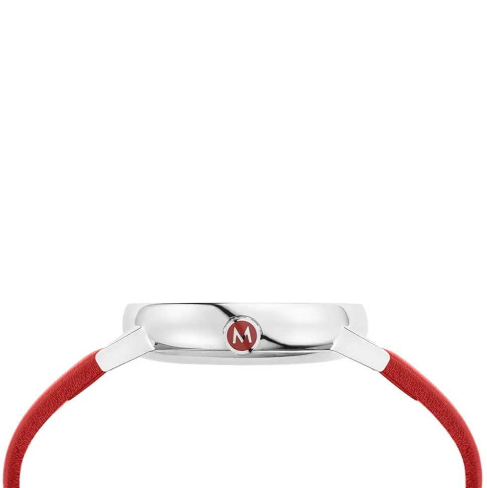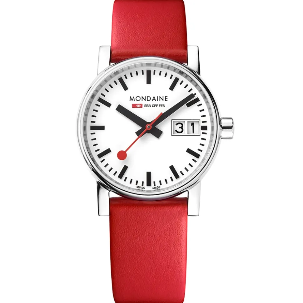 This Mondaine Evo2 30mm watch has a Big Date function which is clear and easy to read. For maximum comfort, the 30mm polished case is in a seamless, rounded shape complemented by bold red leather strap. The legible dial is in classic white with black indexes and has Mondaine’s famous red sweeping second hand which complements the red strap.