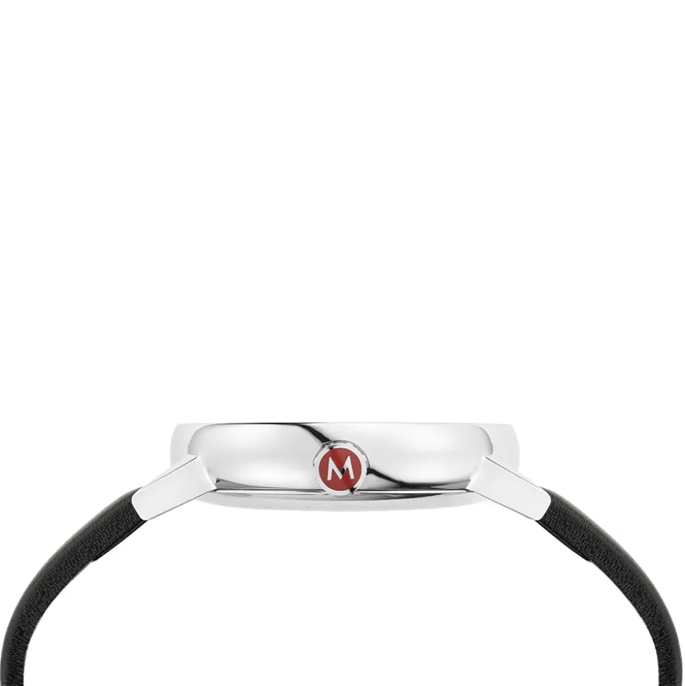 This Evo2 watch has a Big Date function which is clear and easy to read. For maximum comfort, the 40mm polished case is in a seamless, rounded shape complemented by a plain black leather strap. The legible dial is in classic white with black indexes and has Mondaine’s famous red sweeping second hand.