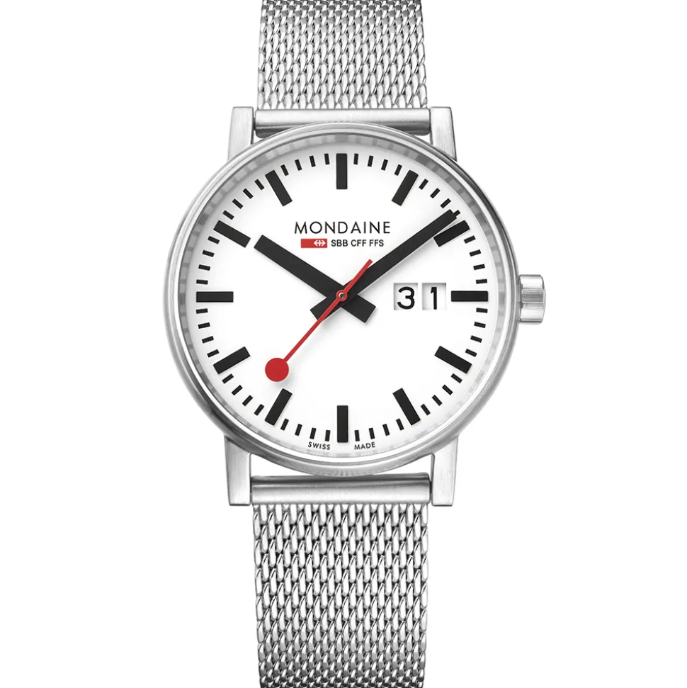 The Mondaine Evo2 Big Date Watch has the iconic, minimalist dial which has made the design a cult classic. However, the original design has evolved into a collection with more fluid lines and rounded surfaces.