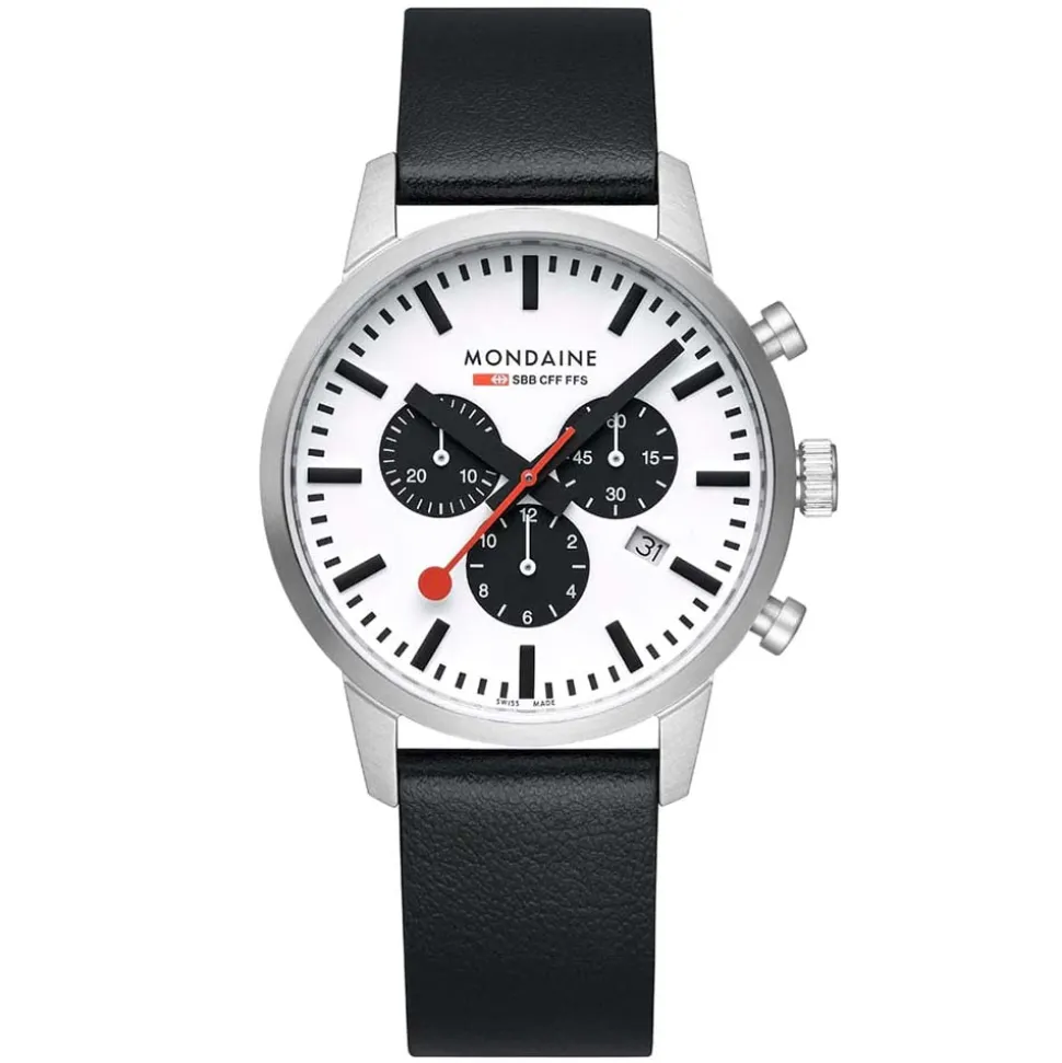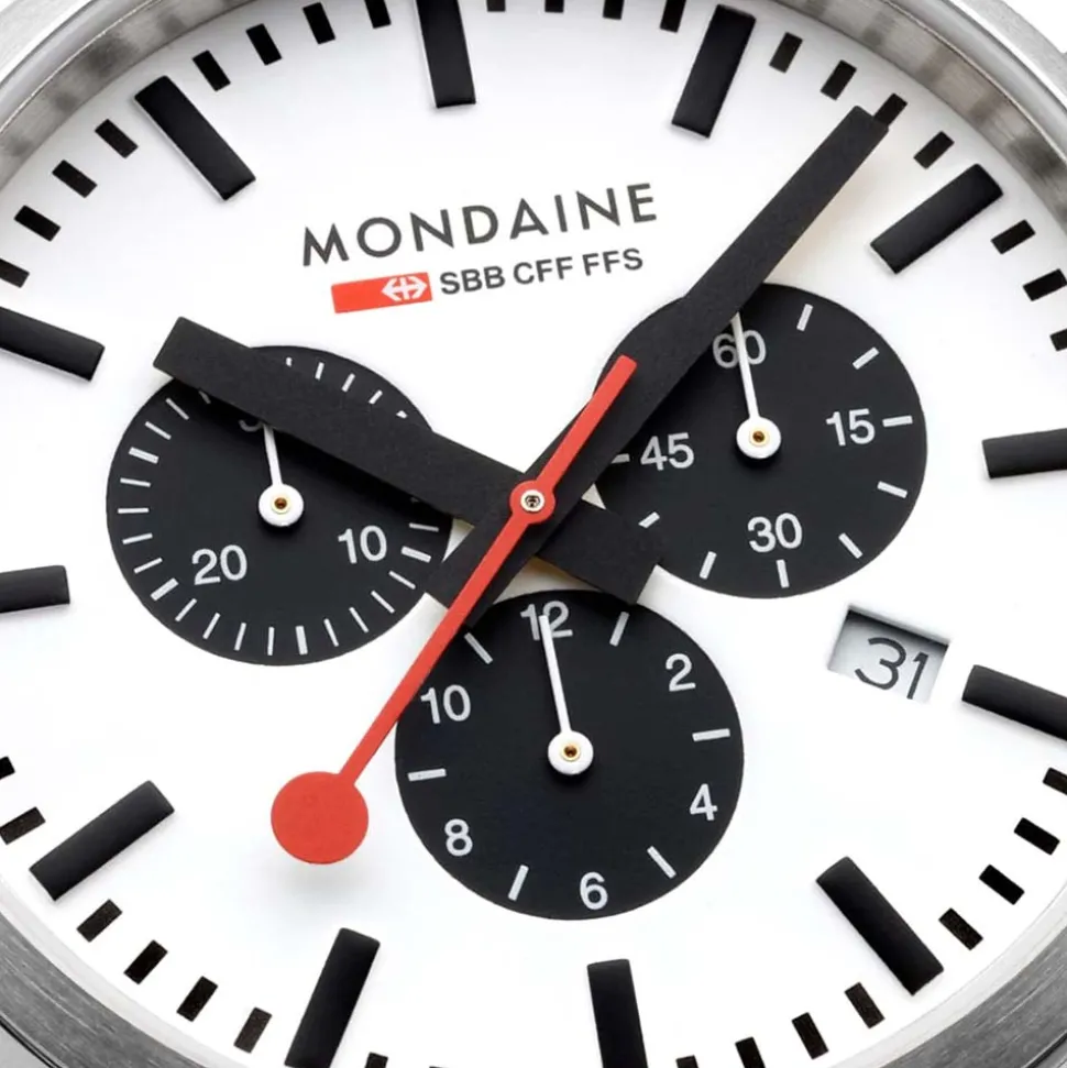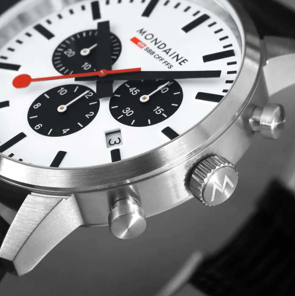 The Mondaine Neo Chronograph 41mm seamlessly blends the classic panda dial, a white dial with black sub-dials, with the iconic Swiss Railways station design, creating an irresistibly appealing fusion of two watch classics. Just like in the original panda dials, the subdials are in the 3, 6 and 9 o’clock position mimicking the markings of a panda face.