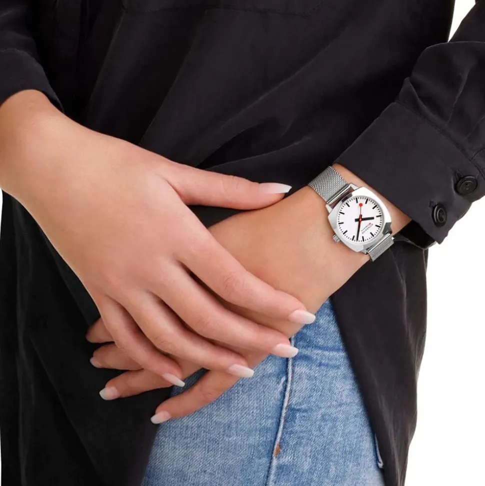The Mondaine Petite Cushion 31mm on a stainless steel mesh bracelet takes its inspiration from a vintage case design.