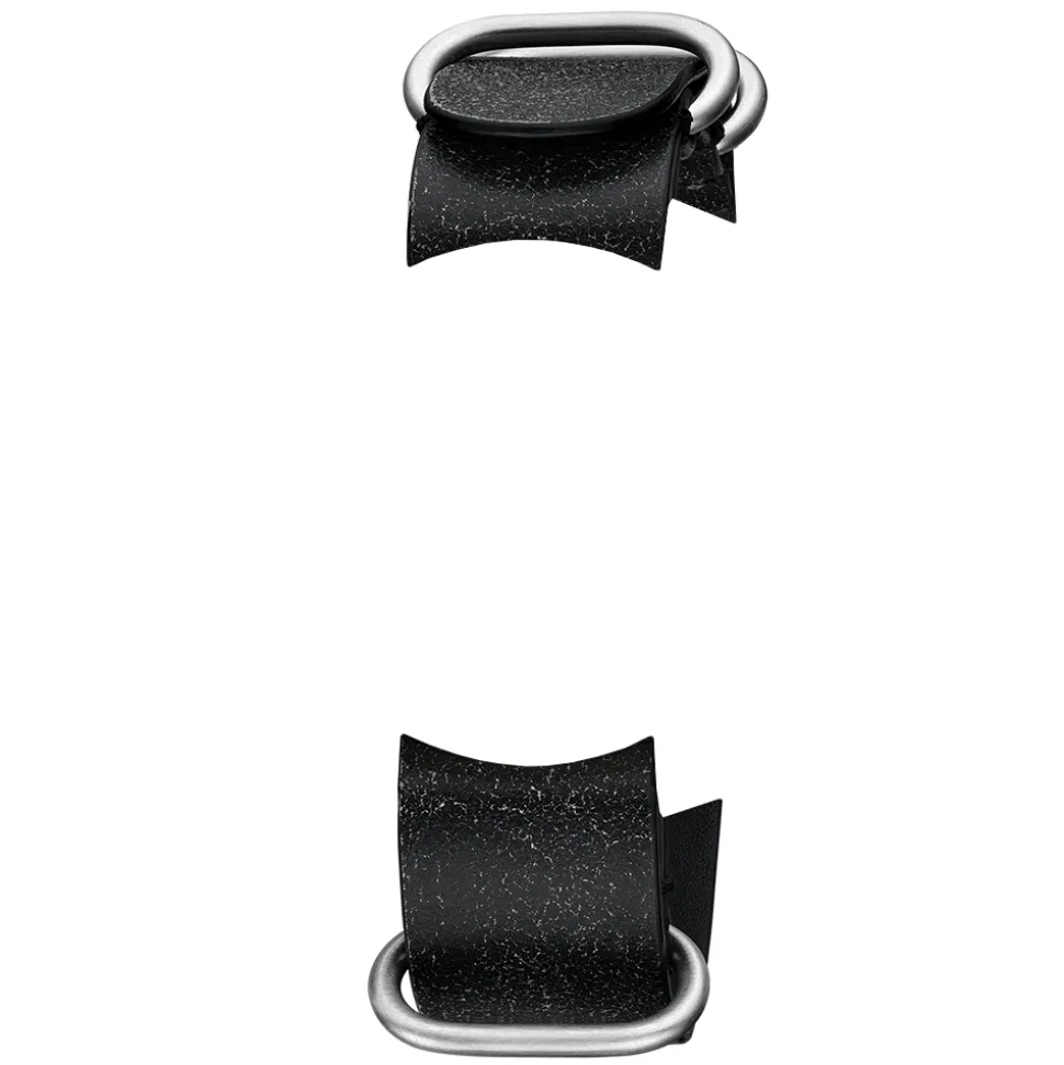 Secondly, made from black leather, it has a smooth finish with flecks of grey.