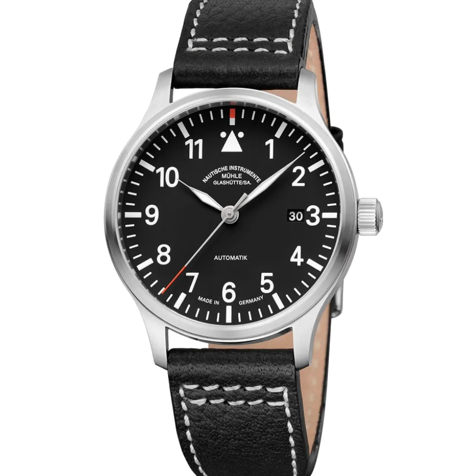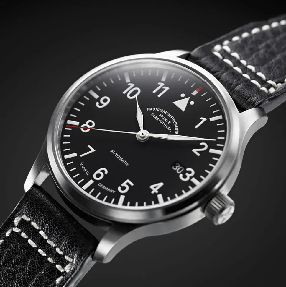 The Terrasport collection of pilot watches from Mühle is designed with absolute precision and reliability in mind. Terrasport II has a 40mm brushed stainless steel case with a screw-down crown. Also, for maximum contrast, the dial is black with bold white arabic numerals. Coated in Super LumiNova, the hands and dial markers are easy to read even in poor light. Furthermore, the pilot triangle at 12 o’clock is a nod to the heritage of this design. Also, the second hand has a red tip which corresponds with a red marker at 12 o’clock.