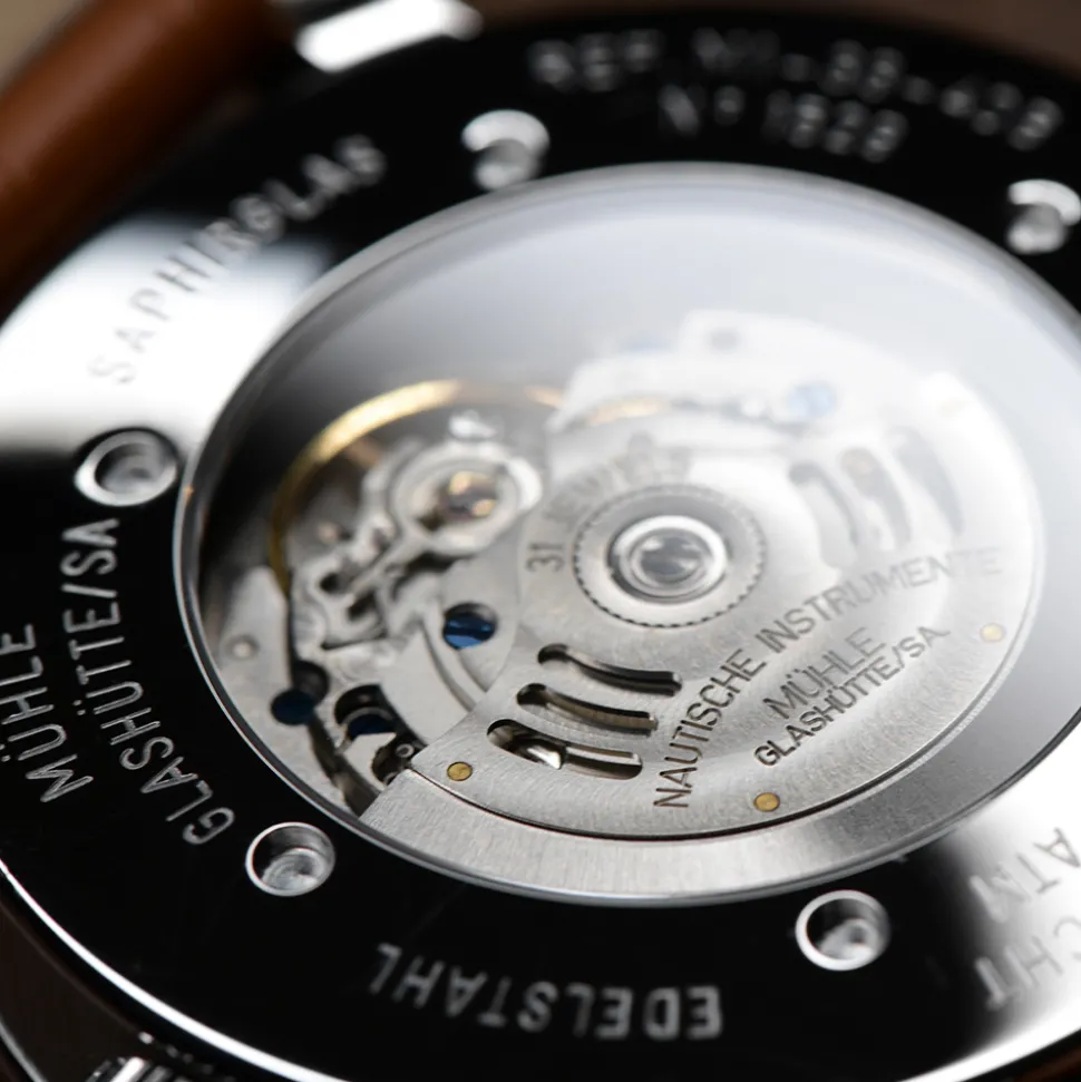 - SW 260-1 automatic movement, Mühle version with patented woodpecker neck regulation (for shockproofing), own rotor and characteristic Mühle surface finishes