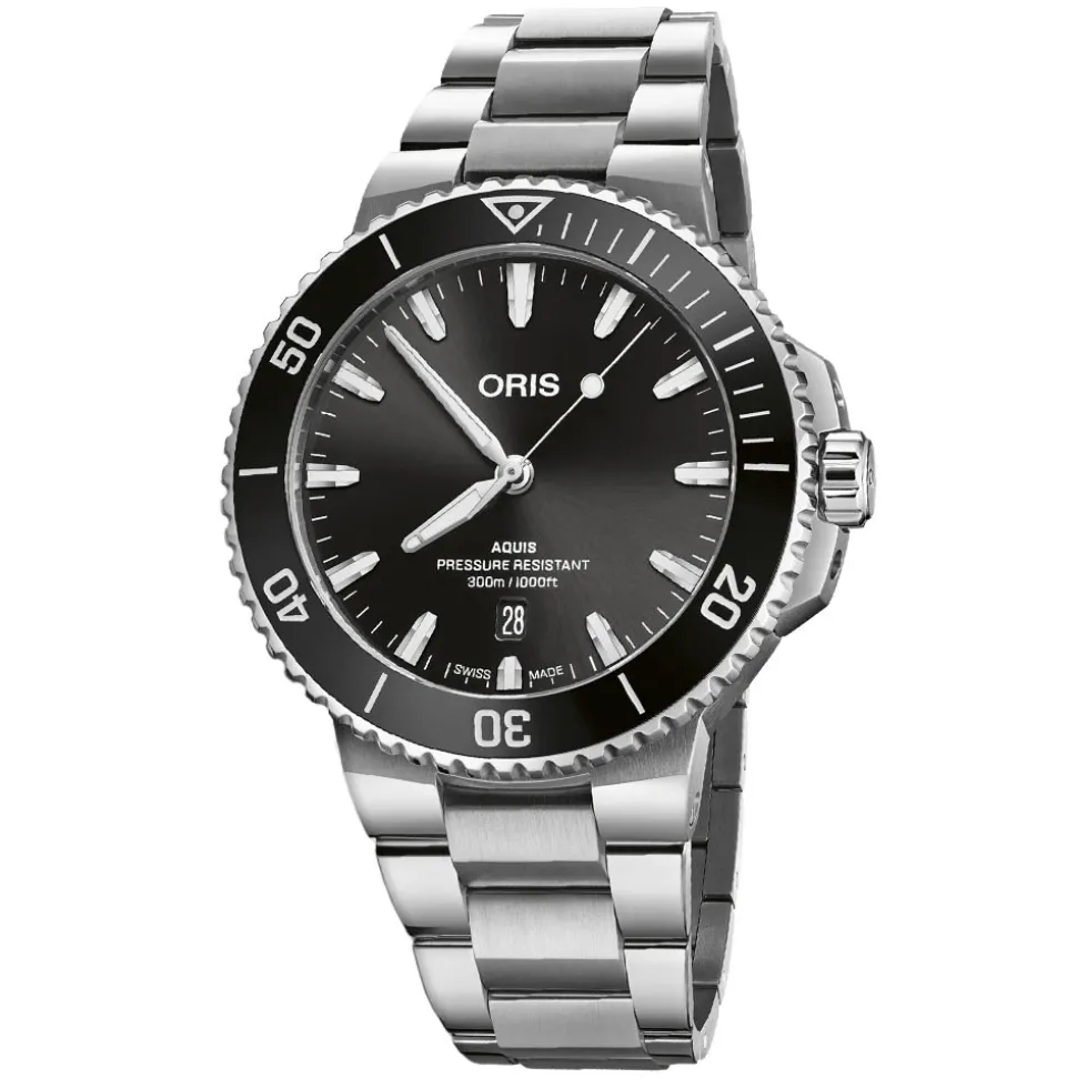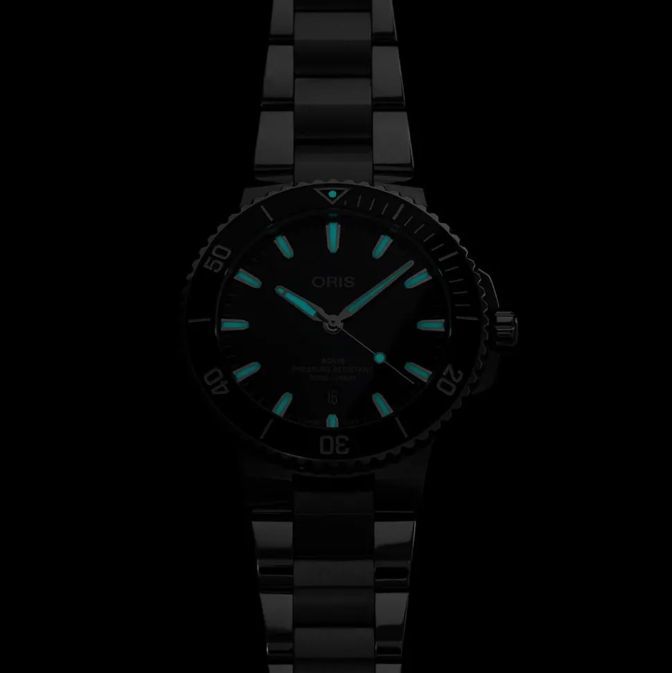 Equipped with a precision Oris 733-1 automatic movement, the Aquis has a 41 hour power reserve. Furthermore, water resistant to 30 bars (300m), the Aquis has an easy grip screw-down crown. Similarly, the see-through caseback also screws-in. Finally, the stainless steel bracelet has a secure folding clasp with extension. This makes it more comfortable when diving.