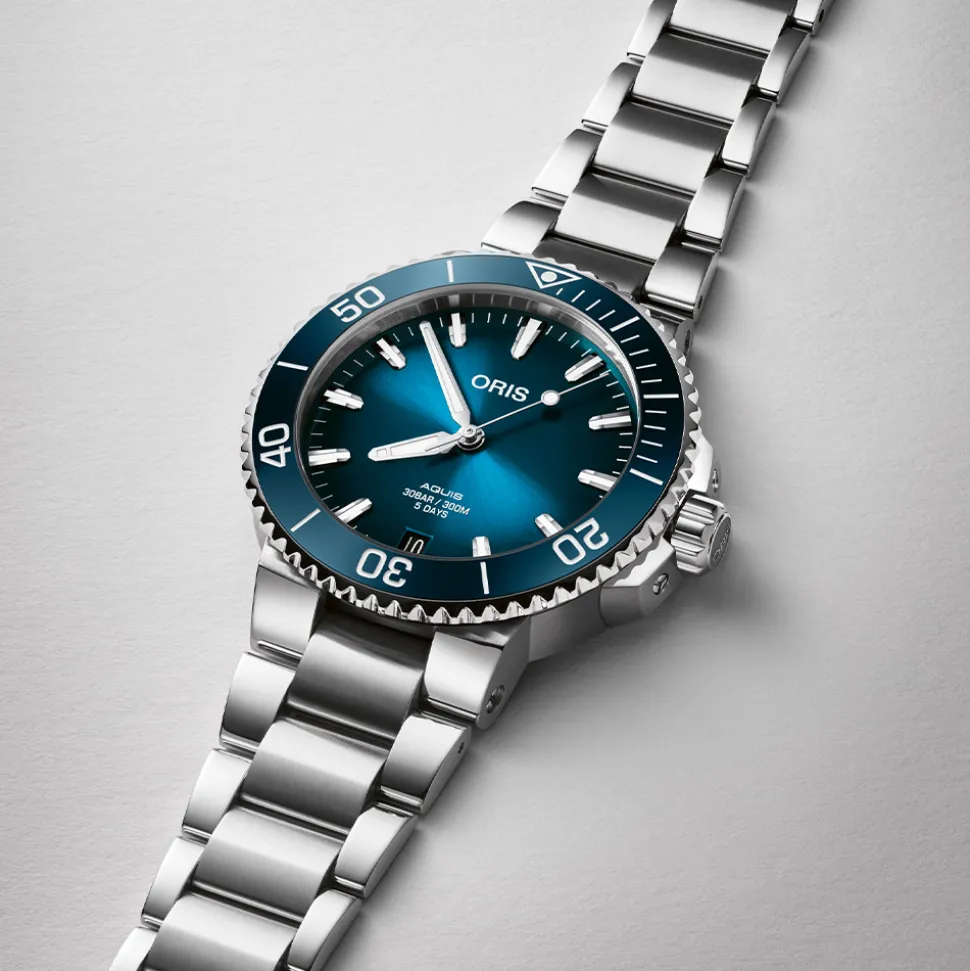 The deep blue shades of the Oris Aquis Date Calibre 400 Watch reflect the intense cool blue waters of the ocean, and with an impressive 300-metre water resistance, this model is ready to explore deep below the ocean’s dramatic blue surface. Firstly, the multi-piece stainless steel case is 41.50mm in diameter with a blue ceramic top ring set into the bezel for effectively measuring elapsed time underwater. Secondly, the blue dial has bold, white hour markers. Along with the hands, these are coated in superluminova for legibility in poor light. Additionally, a white minute track ensures the dial is easy to read. Finally, a domed anti-reflective sapphire crystal protects the dial.