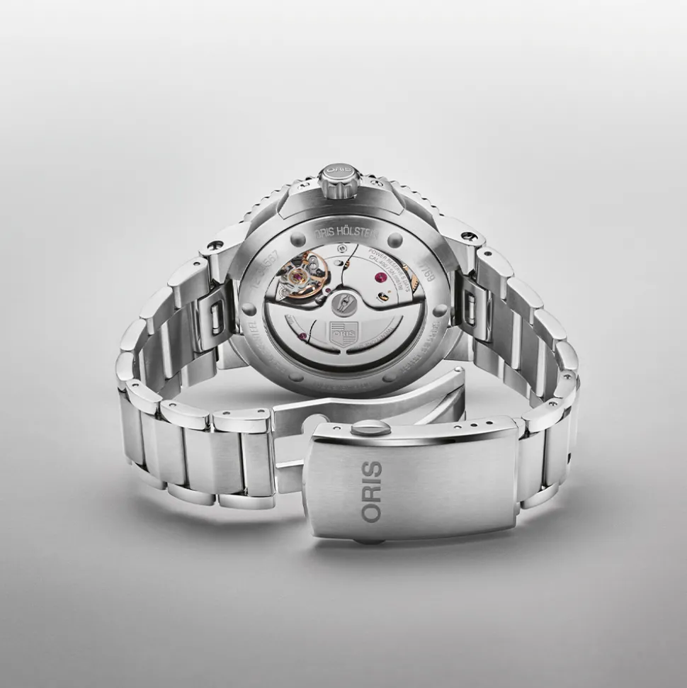 The Oris Aquis Date Calibre 400 Watch has an incredible 120 hour power reserve which is very useful for anyone who doesn’t wear their watch every day. Also, it has an easy grip screw-down security crown. Similarly, the see-through sapphire crystal caseback also screws-in and grants a clear view into the performance of the Calibre 400. Finally, the solid stainless steel bracelet has a folding clasp with diving extension facility for wearing over the top of a heavy diving suit.