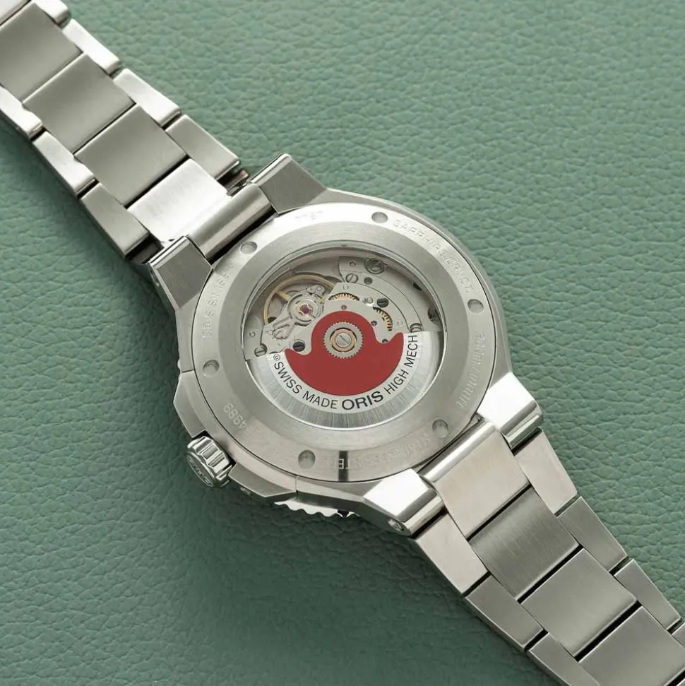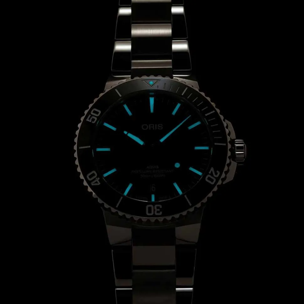 Equipped with a precision Oris 733-1 automatic movement, the Aquis has a 41 hour power reserve. Water resistant to 30 bars (300m), the Aquis has an easy grip screw-down crown. Similarly, the see-through caseback also screws-in. Finally, the stainless steel bracelet has a secure folding clasp with extension to make it more comfortable when diving.
