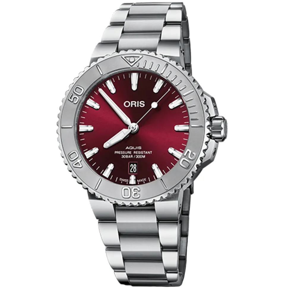 Equipped with a precision Oris 733 automatic movement, the watch has a 38 hour power reserve. Water resistant to 30 bars (300m), the Aquis has an easy grip screw-down crown. Similarly, the see-through caseback also screws-in and allows a great view of the movement with its iconic red rotor. Finally, the stainless steel bracelet has a secure folding clasp with extension to make it more comfortable when diving.