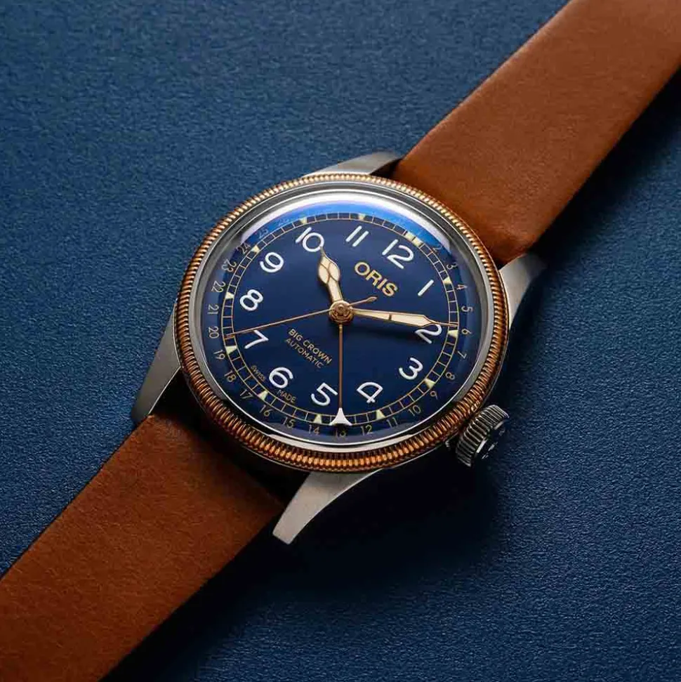 Firstly, the stainless steel case of the Oris Big Crown Pointer date is a functional 40mm in diameter and has a distinctive bronze top ring with a fluted edge. Bronze patinates over time which gives the case a lovely, old world charm. Secondly, the dial is in deep blue which along with the cathedral style hands, adds an elegant touch. It also has bold, arabic figures and hour markers. Along with the hands, these are coated in superluminova for legibility in poor light. Additionally, a traditional minute track ensures the dial is easy to read. The pointer date hand has a white tip and points to the date at the extreme edge of the dial. Finally, the sapphire crystal is domed on both sides. An anti-reflective coating on the inside reduces glare for better legibility in the cockpit.