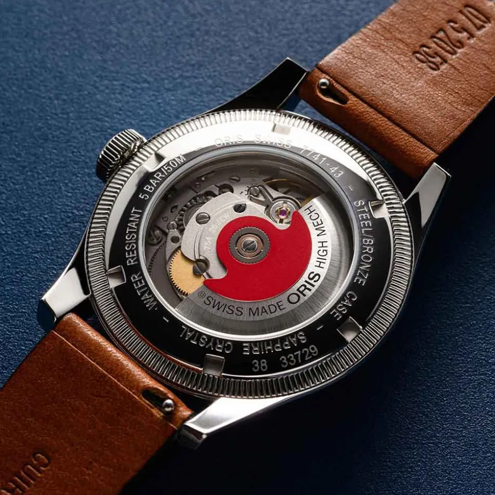 Equipped with a precision Oris 754 automatic movement, the Big Crown Pointer Date has a 38 hour power reserve. In addition it is water resistant to 5 bars (50m) and has a large easy grip screw-down crown. This is oversized to allow for use when wearing gloves. Similarly, the see-through caseback also screws-in and allows a fantastic view of the movement in action. Finally, the leather strap is deliberately plain with no stitching and it’s brown tone complements the bronze bezel.