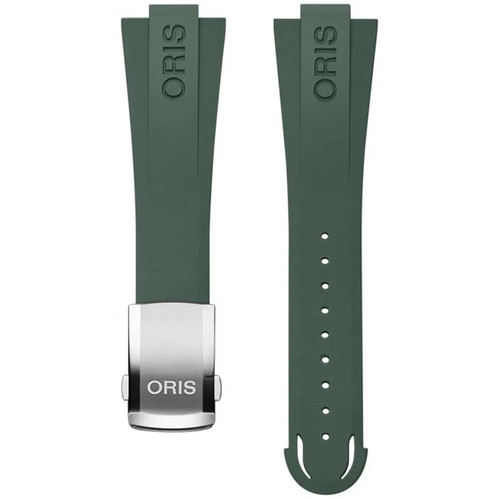 The strap fits seamlessly onto cases with a 22mm interhorn width, including the Oris Aquis Date reference 01 733 7787 4157-07 4 22 37FC . Its vibrant green rubber construction adds a bold and sporty touch, while the ORIS branding stamped on both ends highlights its authenticity and quality. It’s also available in Blue.