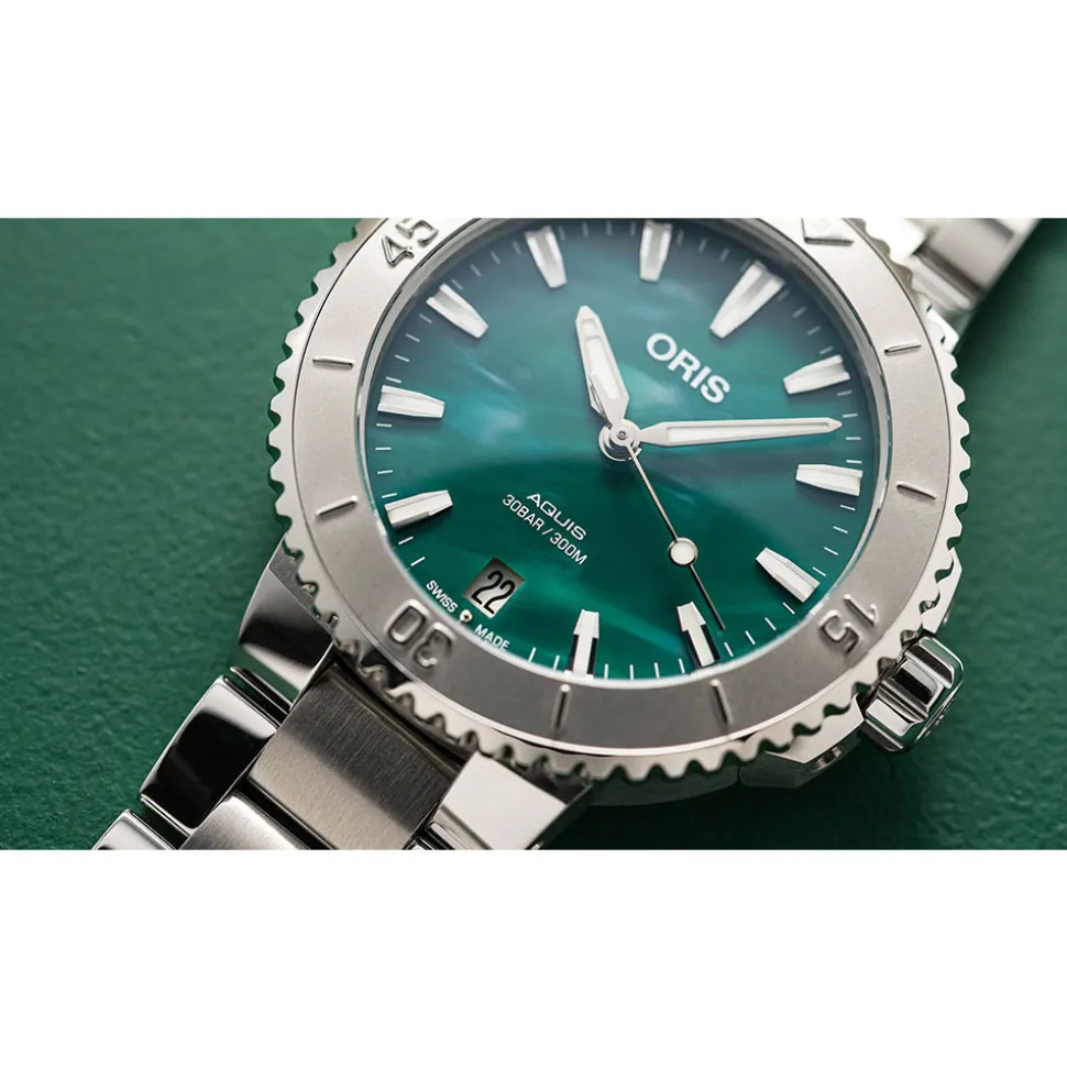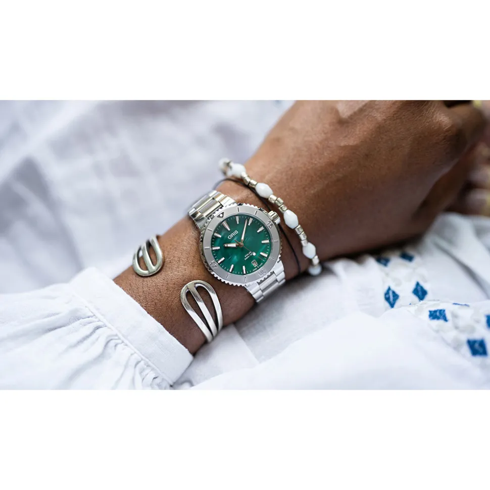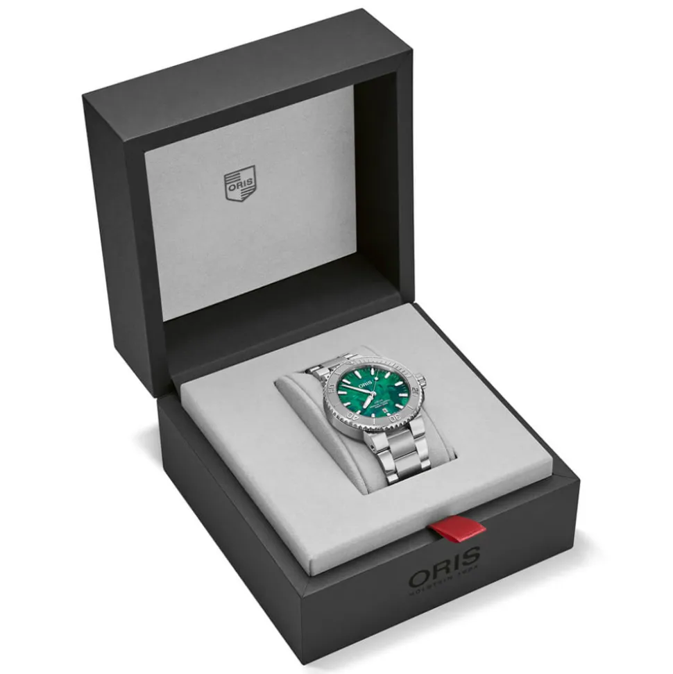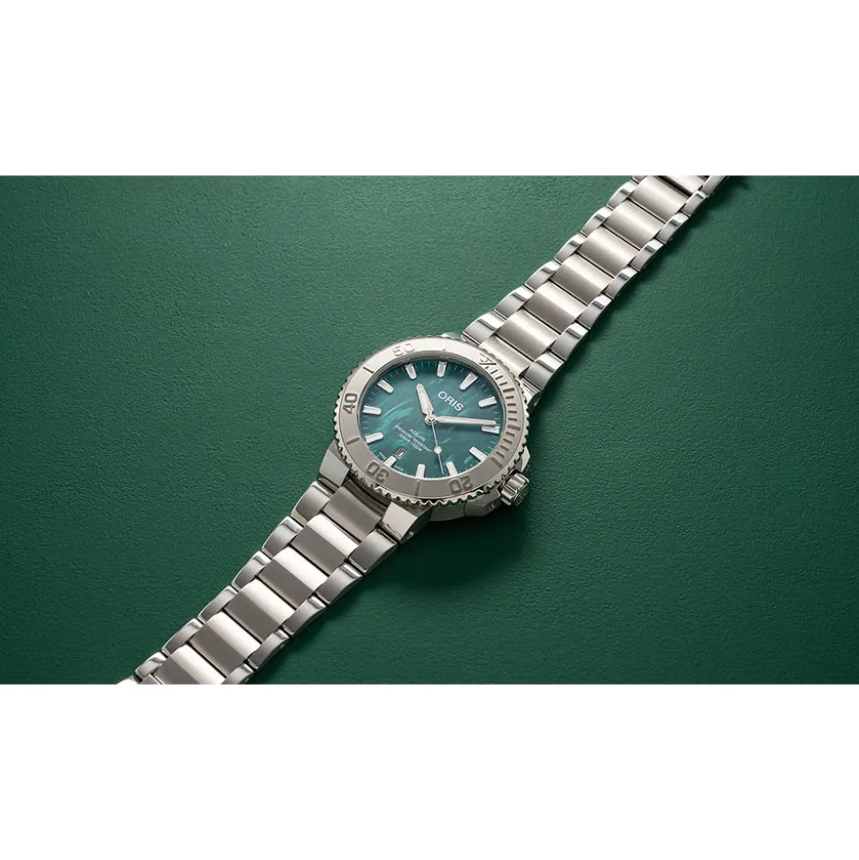 Firstly, the stainless steel case of the Oris X Bracenet is 43.5mm in diameter (view 36.5mm version here) with a uni-directional bezel. The bezel has a minute scale for measuring elapsed time. Secondly, the eye-catching green dial has bold, white hour markers. Along with the hands, these are coated in superluminova for legibility in poor light. Additionally, a white minute track ensures the dial is easy to read. Furthermore, a domed anti-reflective sapphire crystal protects the dial.
