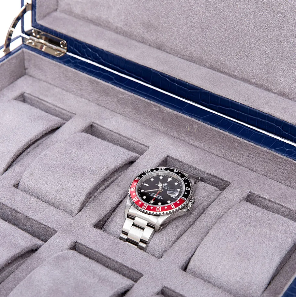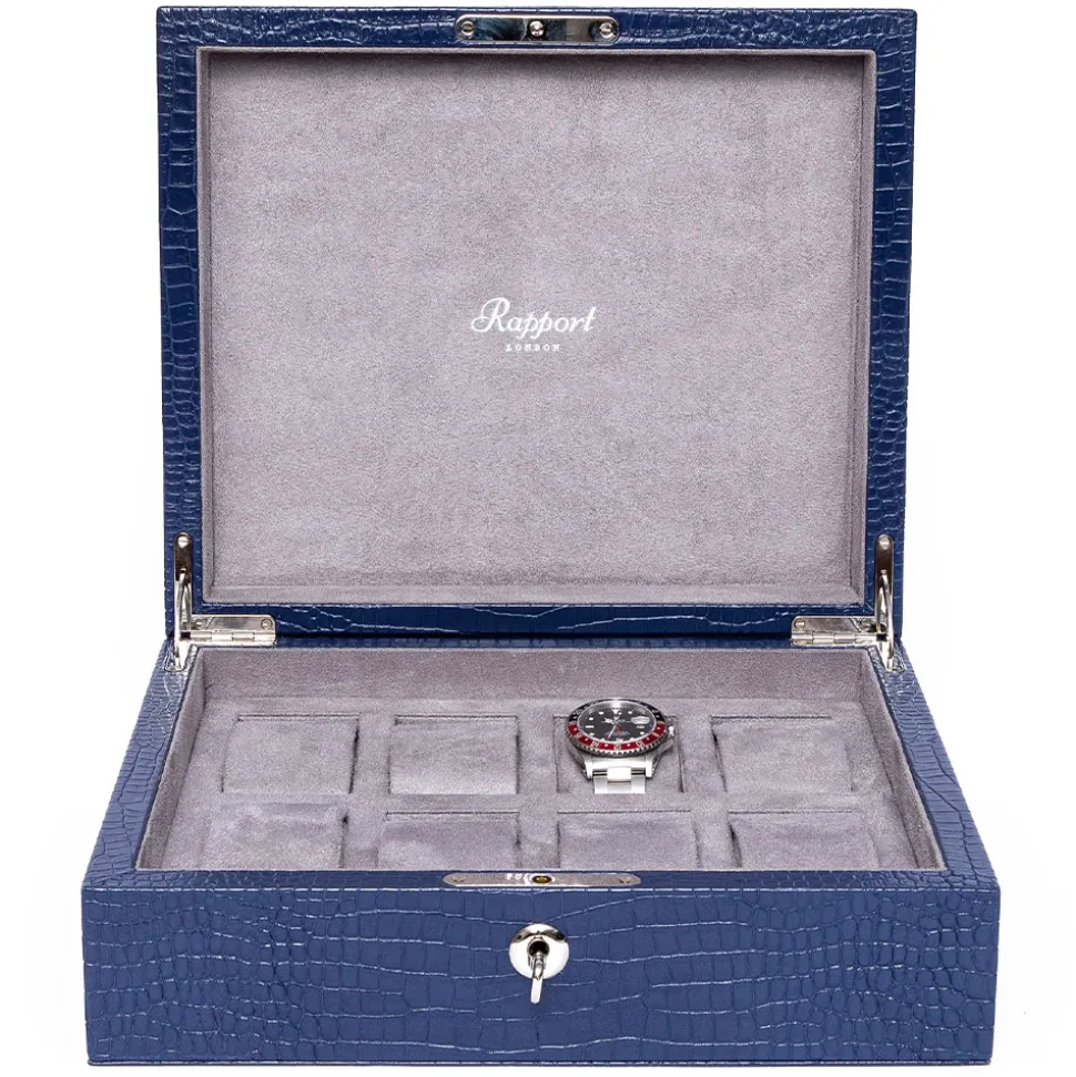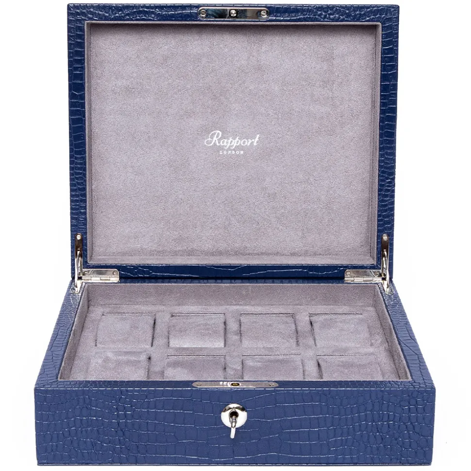Firstly, hand crafted from premium blue leather, it is in a crocodile effect finish. Secondly, the interior is lined in soft, grey suede to complement the exterior. Additionally, the hinges together with the lock and key are in a polished chrome finish. Finally, the eight watch cushions are adjustable to fit large and smaller watches. Each cushion sits in its own separate compartment.