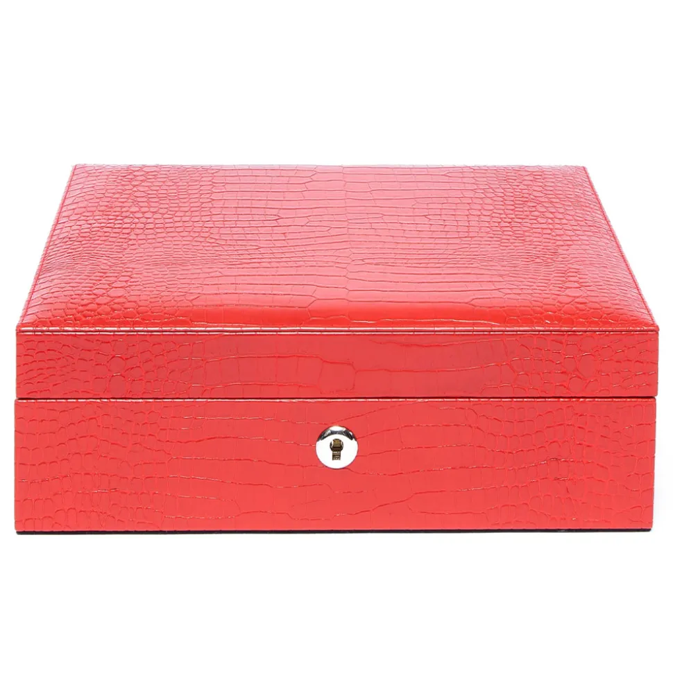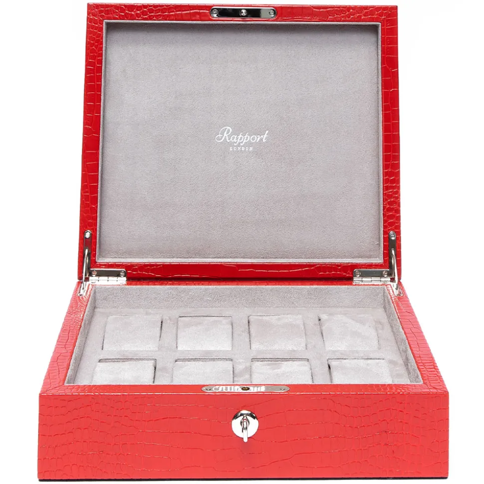 Firstly, hand crafted from premium red leather, it is in a crocodile effect finish. Secondly, the interior is lined in soft, grey suede to complement the exterior. Additionally, the hinges together with the lock and key are in a polished chrome finish. Finally, the eight watch cushions are adjustable to fit large and smaller watches. Each cushion sits in its own separate compartment.