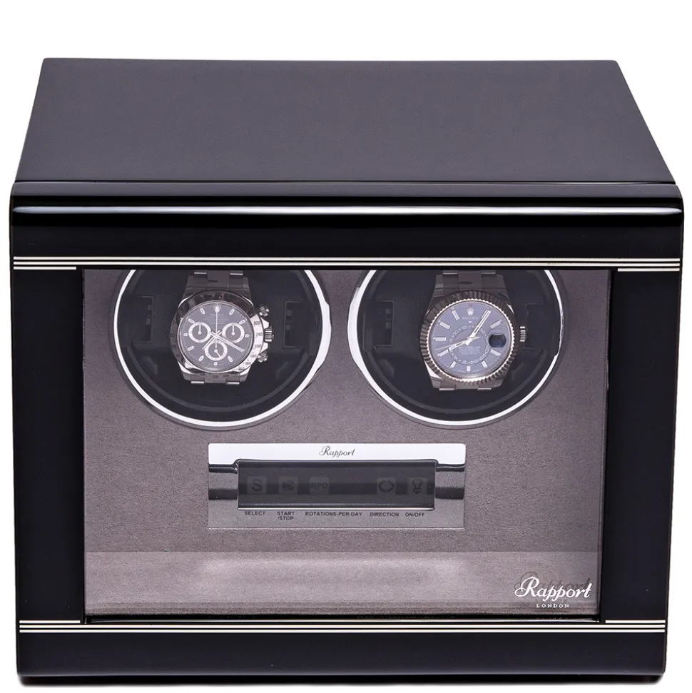 Firstly, this Rapport Formula Duo Watch Winder is in a high-gloss ebony black finish with chrome fittings. Secondly, it has a soft, grey velvet interior which adds to the luxury feel. Interior lighting also gives an enhanced effect. Additionally, it features a lockable front, glass door with three distinct stripes across the front, which distinguish the range. Moreover, an LCD control panel allows you to select a range of settings including rotations per day, rotation direction, and wind speed. Finally, the rotors are virtually silent and will effortlessly keep your watches moving.