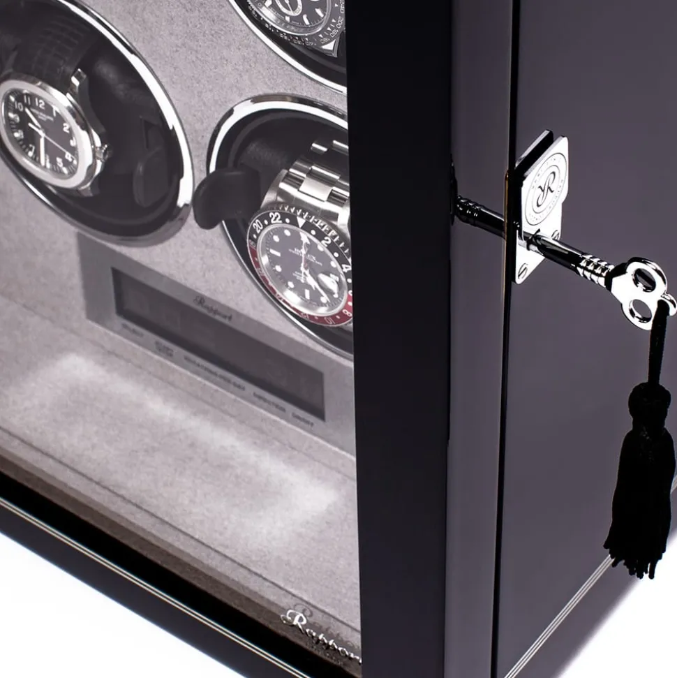 Firstly, this Rapport Formula Six Watch Winder is in a high-gloss ebony black finish with chrome fittings. Secondly, it has a soft, grey velvet interior which adds to the luxury feel. Interior lighting also gives an enhanced effect. Additionally, it features a lockable front, glass door with three distinct stripes across the front, which distinguish the range. Moreover, an LCD control panel allows you to select a range of settings including rotations per day, rotation direction, and wind speed. The rotors are individually programmable so that each watch can be given the attention it deserves. Finally, the rotors are virtually silent and will effortlessly keep your watches moving.