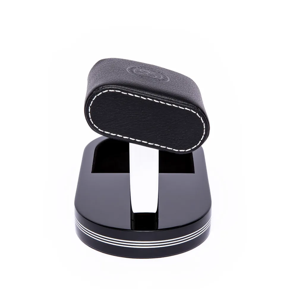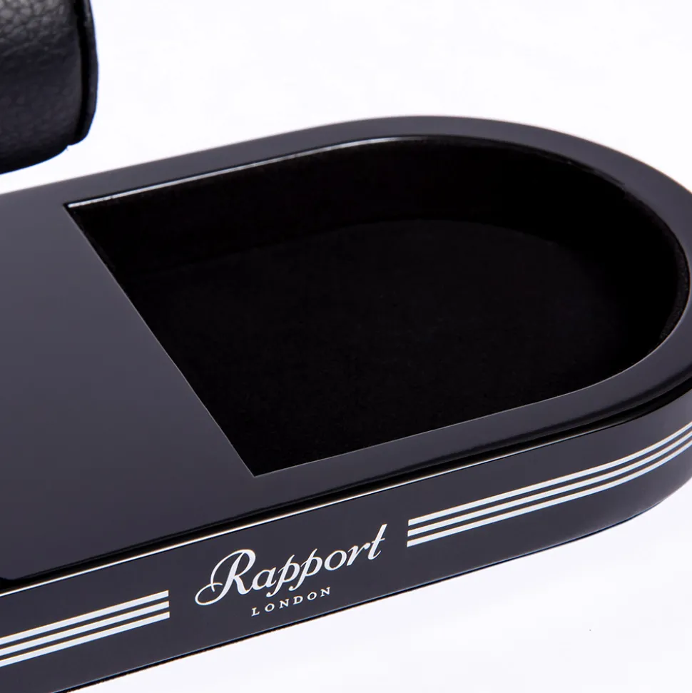 Firstly, a black high gloss base holds up a premium leather cushion for your watch to rest on. This protects your timepiece from scratches and displays it in a simple but elegant way. Secondly, the cushion has silver stitched sides. Furthermore, it is embossed with the Rapport insignia. Additionally, there is a tray for your AirPods, jewellery or cufflinks. Finally, silver stripes wrap around the base to match the silver tone of the chrome metal rod.