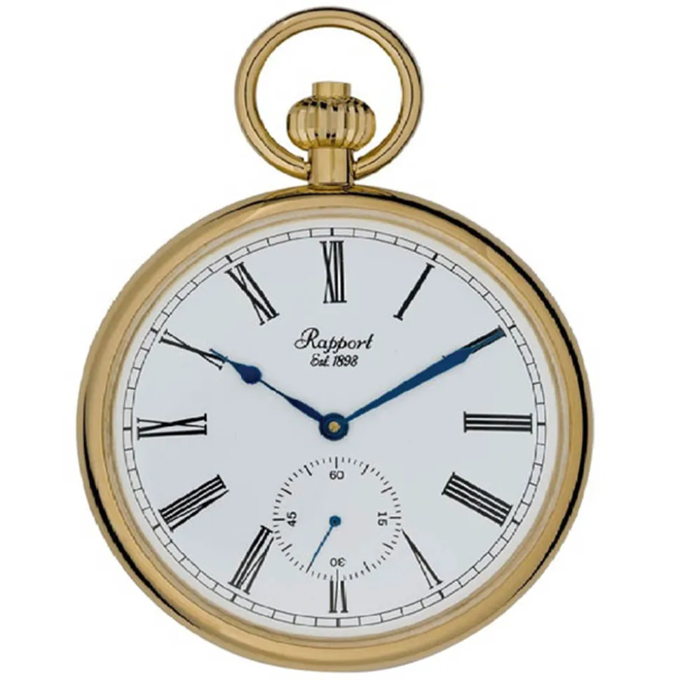 This Rapport Mechanical Open Face Pocket Watch has an elegant 52mm diameter case. In polished yellow gold plated metal, it has no cover so it is easy to quickly pull out and view the time.