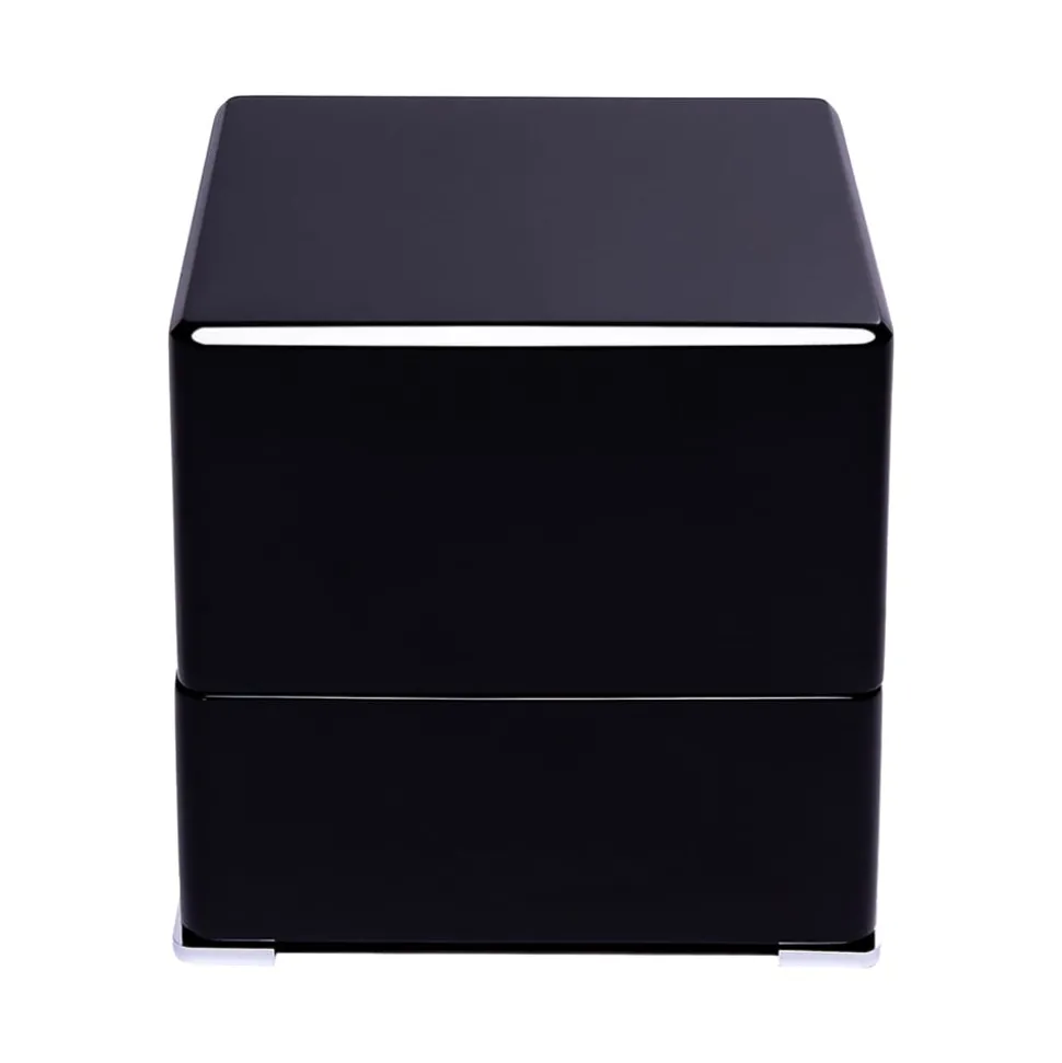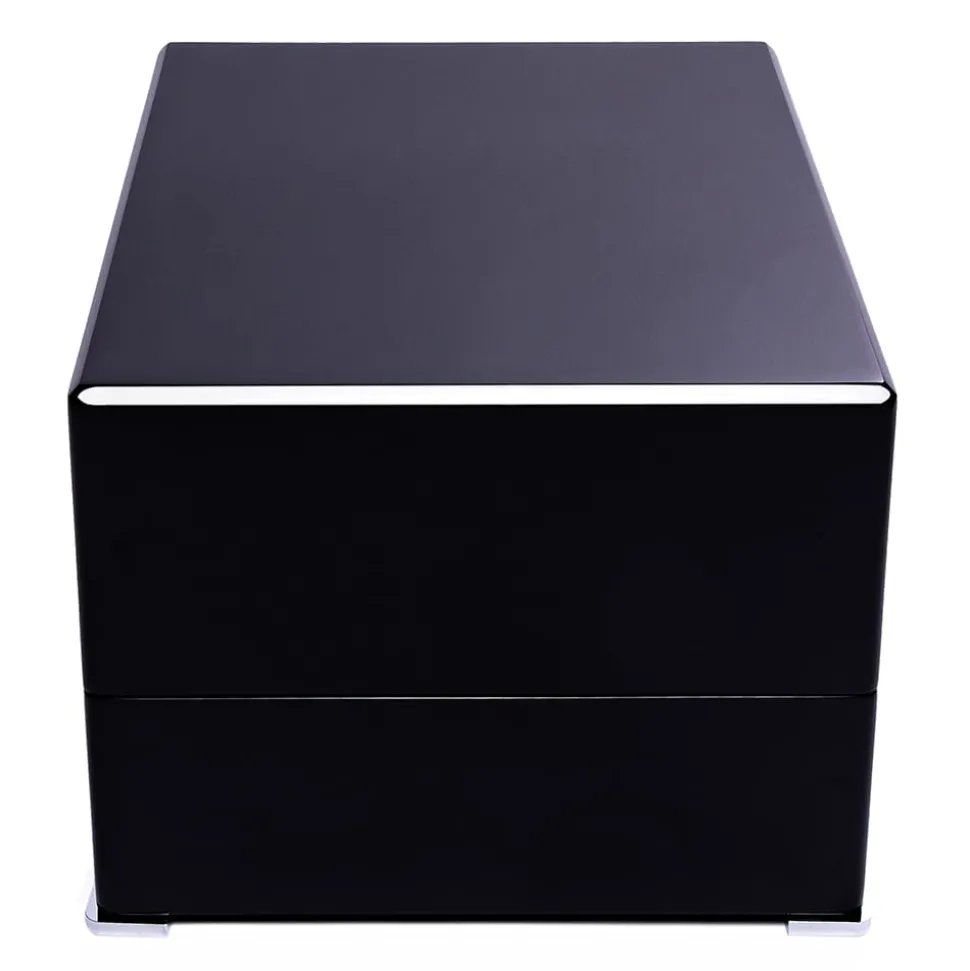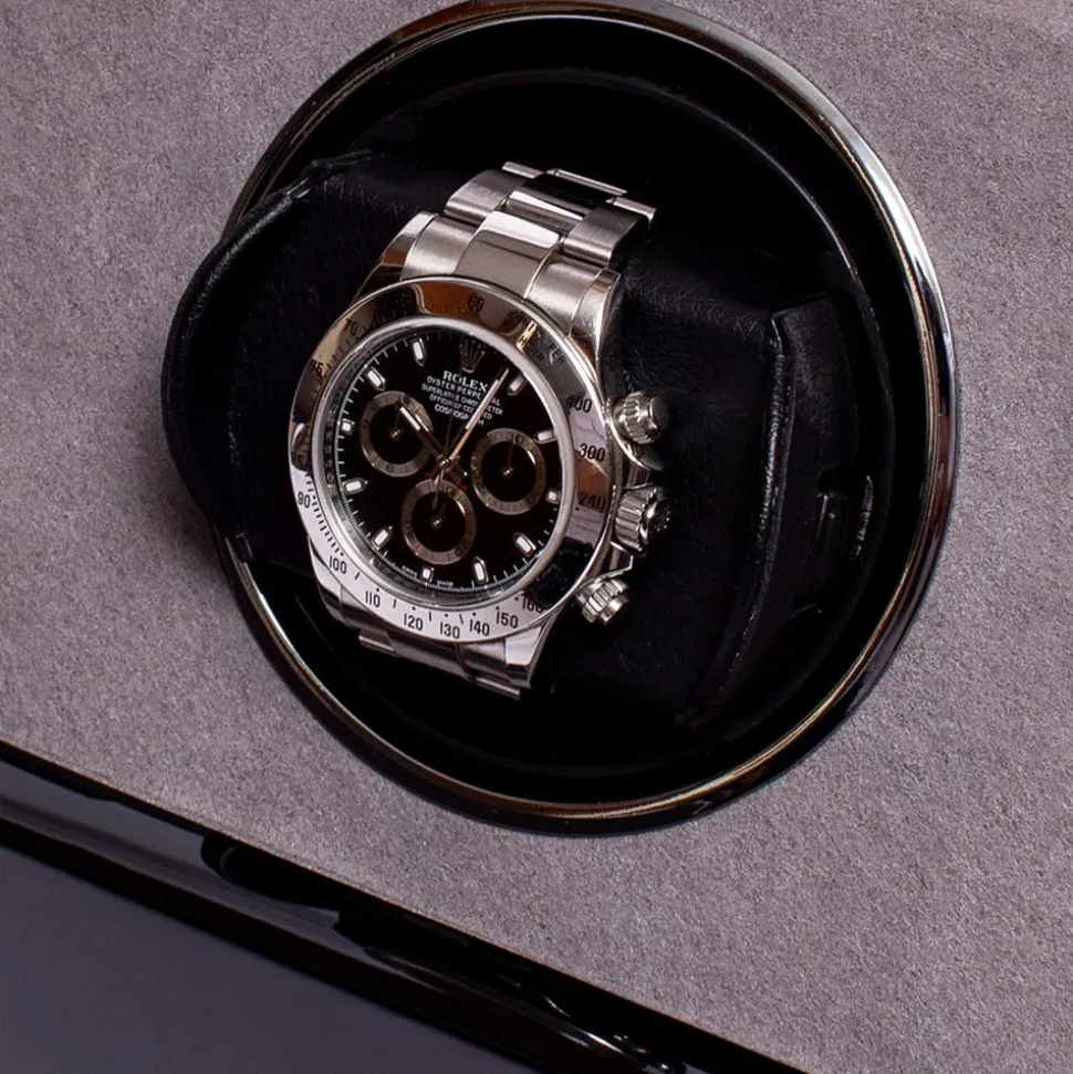 This Rapport Perpetua III Single Watch Winder is in a Black Ebony finish and has chrome fittings. The interior is lined with a soft, grey velvet which adds a touch of luxury to this beautiful object. It is controlled using a touchscreen panel that allows you to adjust things like rotations per day, rotation direction, and wind speed. The mechanics are exceptionally quiet and will keep your watch wound without noisy rotation.