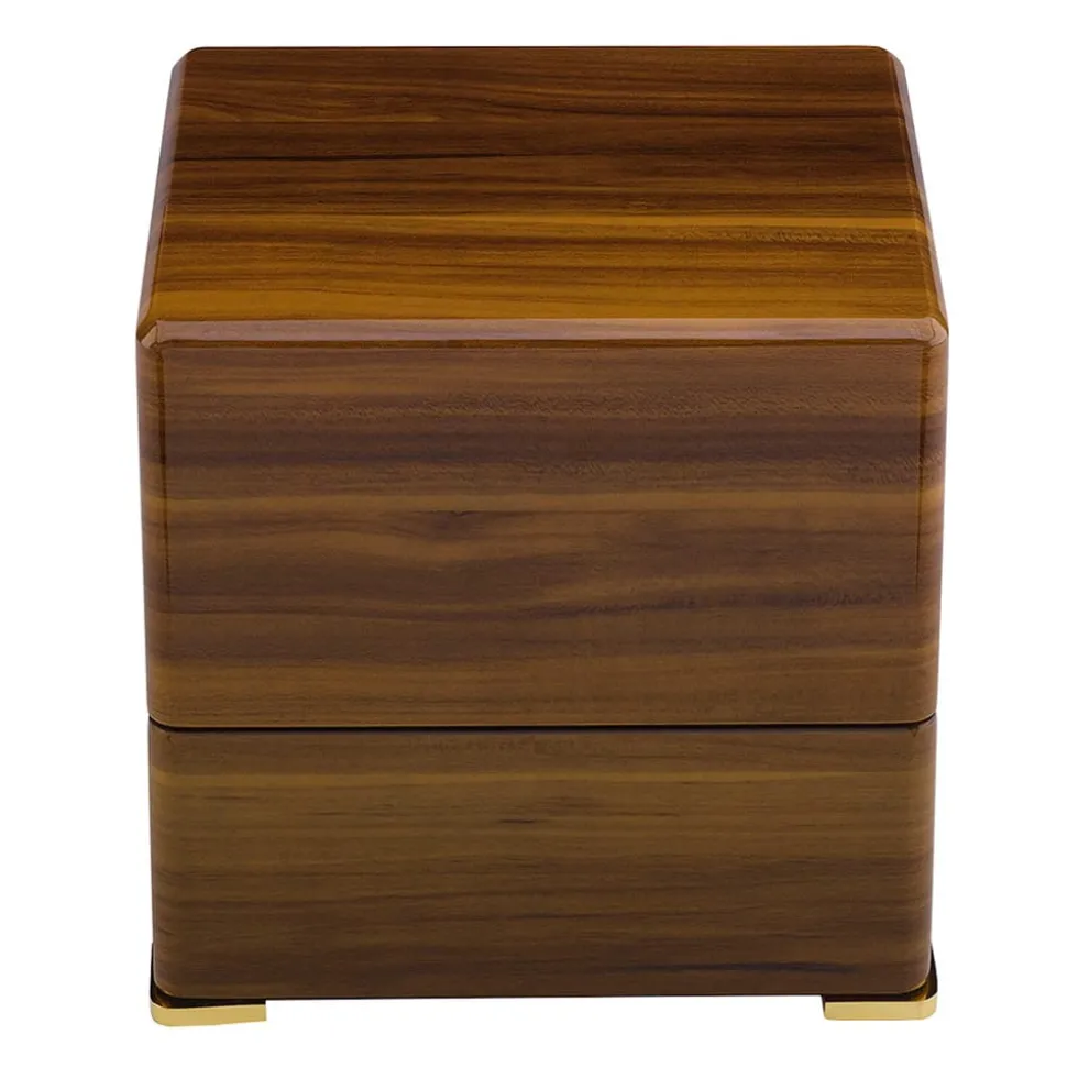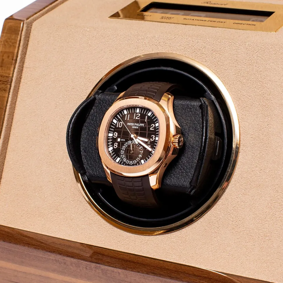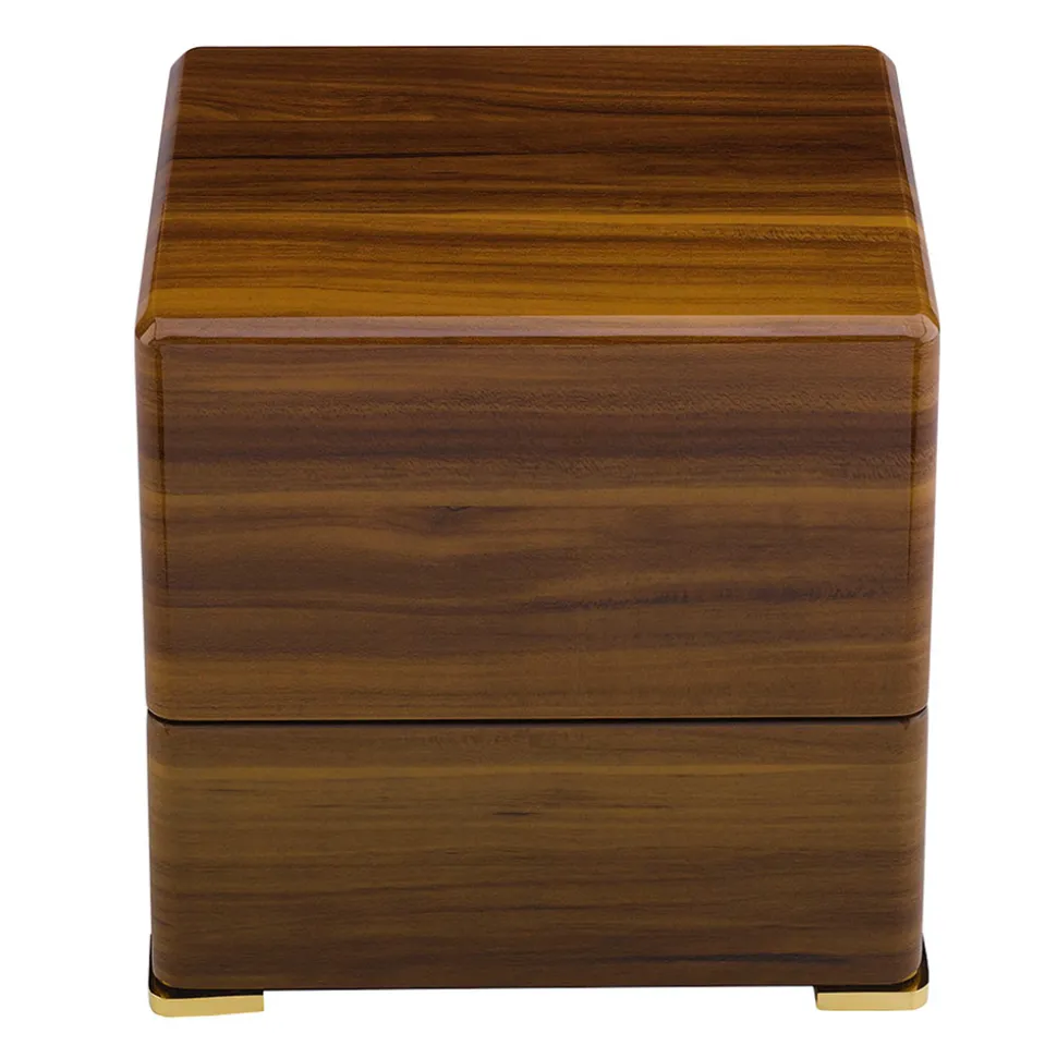 This Rapport Perpetua III Single Watch Winder is in a Walnut finish and has gold plated fittings. The interior is lined with a soft, beige velvet which adds a touch of luxury to this beautiful object. It is controlled using a touchscreen panel that allows you to adjust things like rotations per day, rotation direction, and wind speed. The mechanics are exceptionally quiet and will keep your watch wound without noisy rotation.