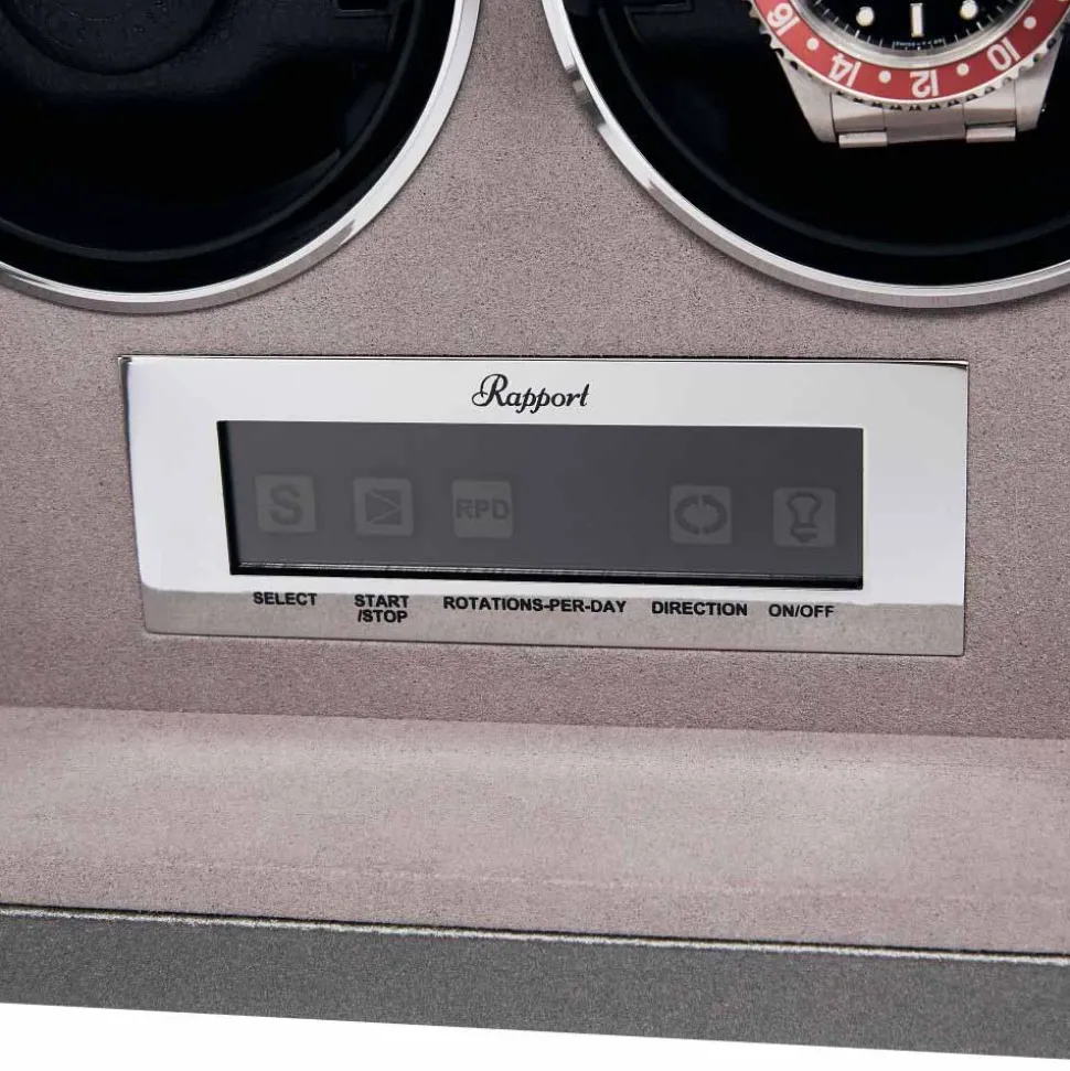 Firstly, this Rapport Quantum Duo Watch Winder is wrapped in premium silver metallic leather. Contrast hand-stitching on the sides adds to the luxury feel. Secondly, it has a soft, grey velveteen interior. Additionally, it features a lockable front, glass door. Moreover, an LCD control panel allows you to select a range of settings including rotations per day, rotation direction, and wind speed. Finally, the rotors are virtually silent and will effortlessly keep your watches moving.
