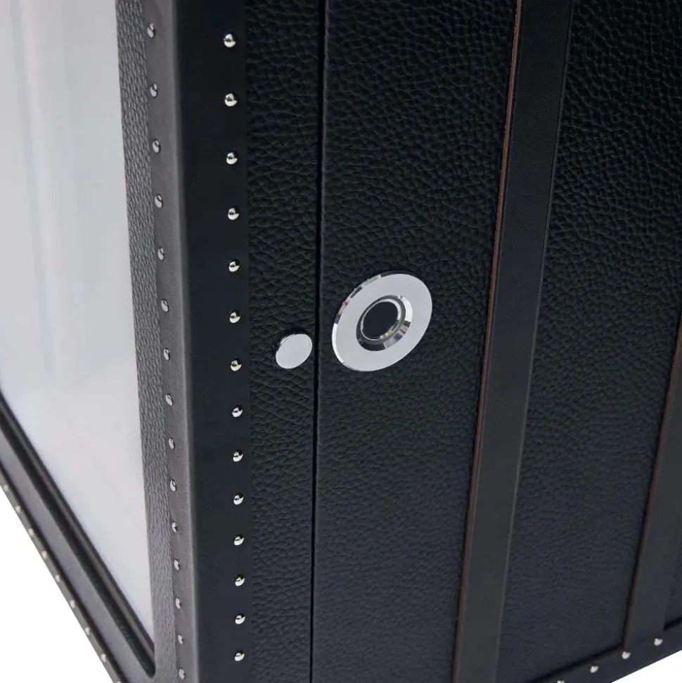 Firstly, the Romer Watch Winder is hand made from the finest grained black leather. With its signature studded edge design, this premium winder has a definite luxurious feel. Secondly, it has a soft velveteen interior. Additionally, to keep your precious timepieces secure, it features fingerprint access on the side of the case. Moreover, a touchscreen LCD control panel allows you to select a range of settings including rotations per day, rotation direction, and wind speed. Finally, the rotors are virtually silent and will effortlessly keep your watches moving.
