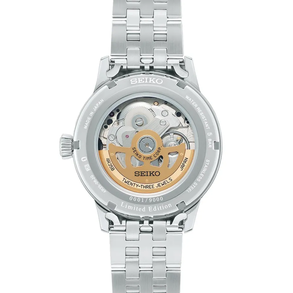 Equipped with an automatic 4R35 calibre, the Seiko Presage Star Bar Cocktail Time Watch has a power reserve of up to 41 hours. Also, it’s possible to manually wind the watch and you can feel the strong torque of the winding mechanism when you grip the uniquely shaped crown. Additionally, the 40.5mm circular case is elegant in polished stainless steel. Furthermore, a see-through screw caseback enables a great view of the movement in action.