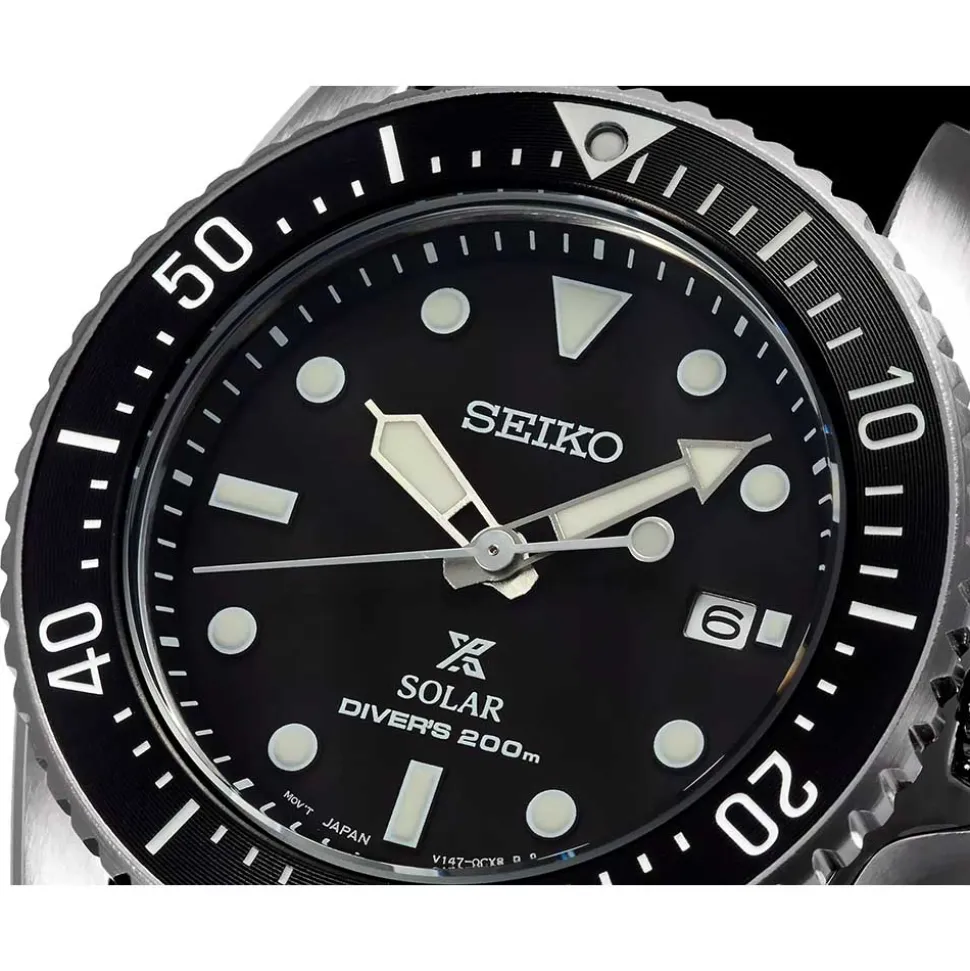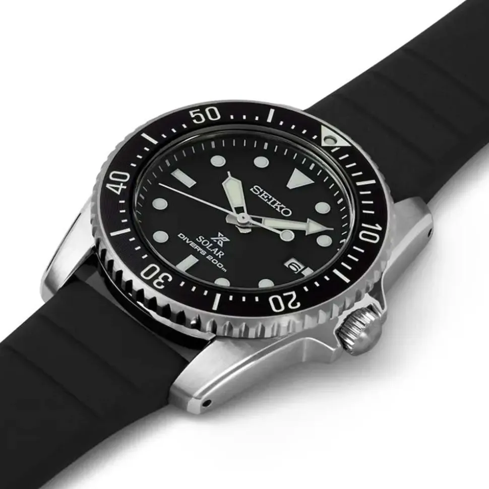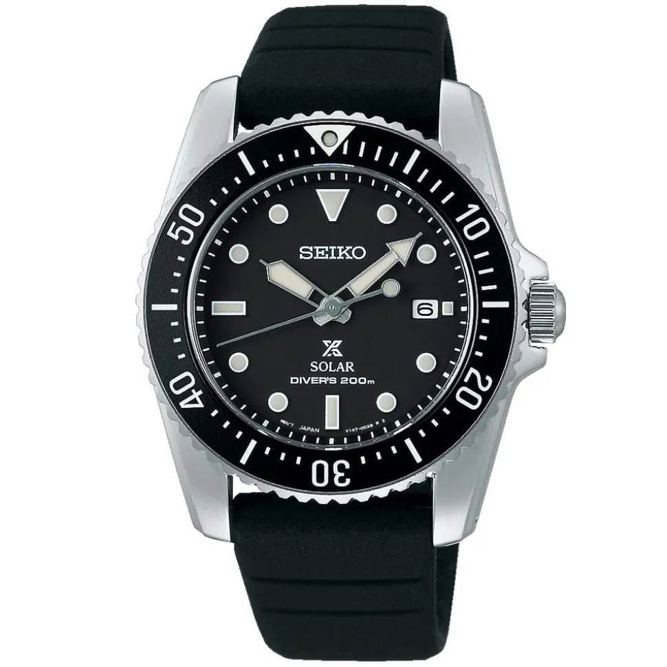 The Seiko Prospex Compact Solar Scuba Diver runs on Seiko’s solar V147 calibre movement, which means it’s powered by any light source and never needs a battery. When fully charged, it can operate for up to 10 months. It also has a date display, overcharge prevention, and a quick-start function for convenience. This is a reliable and stylish choice for any diving enthusiast!