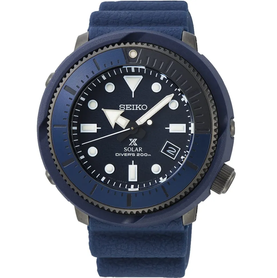 The Seiko Prospex Diver Street Series Watch is a functional diver’s watch given a contemporary reboot. With a definite urban feel, the imposing 46.7mm case is made from black coated stainless steel and blue plastic. Additionally, a blue and black uni-directional bezel surrounds the dial which is in dark blue. High-visibility hour markers and hands coated in Lumibrite make the dial legible and easy to read.