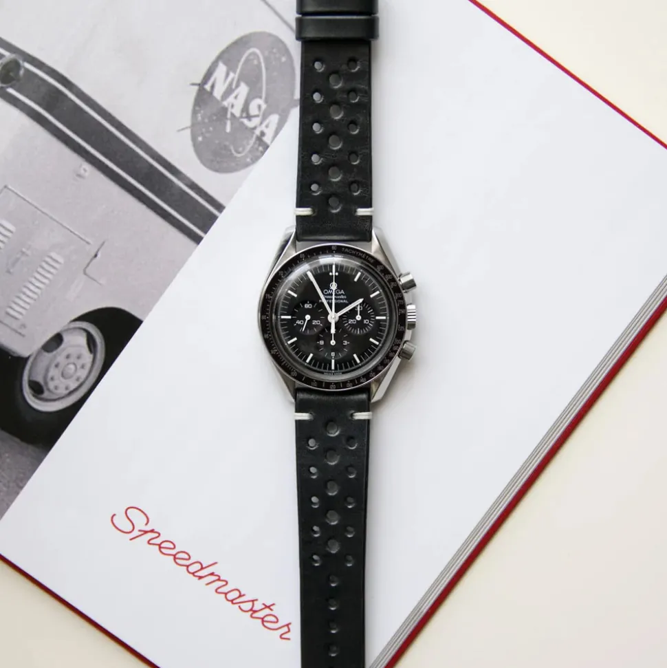 The Silverstone strap draws inspiration from chronograph watches and straps from the ’60s and ’70s seen on the wrists of many racing legends. The perforations increase air flow to the wrist for maximum comfort.